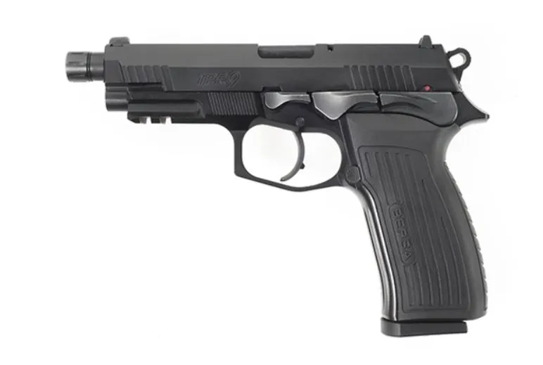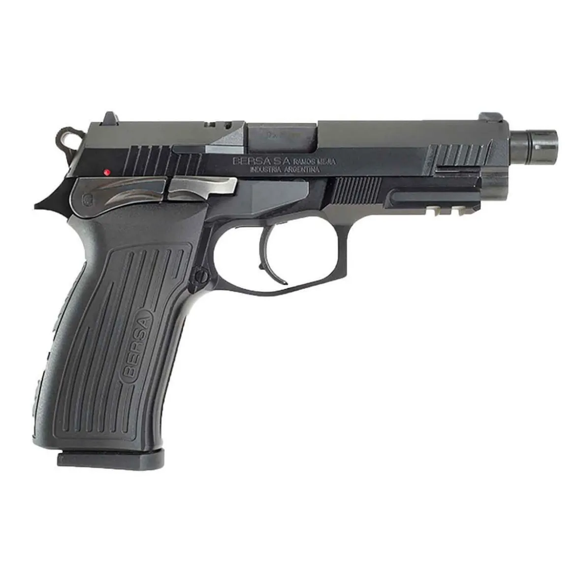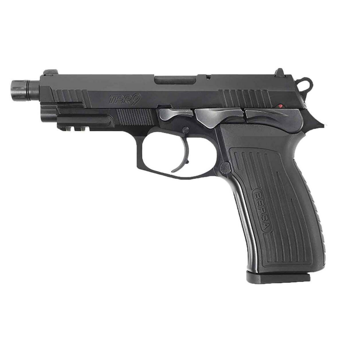 The Bersa TPR9 is a high-performance semi-automatic pistol designed for precision and reliability. Chambered in 9mm, it features a 4.25-inch threaded barrel with a matte black finish, offering both style and robust durability. With a capacity of 17+1 rounds, this firearm is equipped with a Picatinny rail for easy accessory mounting, an extended slide release for enhanced handling, and a loaded chamber indicator for added safety. Interchangeable Sig Sauer type sights and a textured black polymer grip ensure accurate shooting and a secure hold. Ideal for enthusiasts seeking practicality and tactical advantages, the TPR9 stands out in the Thunder 9 Series lineup.