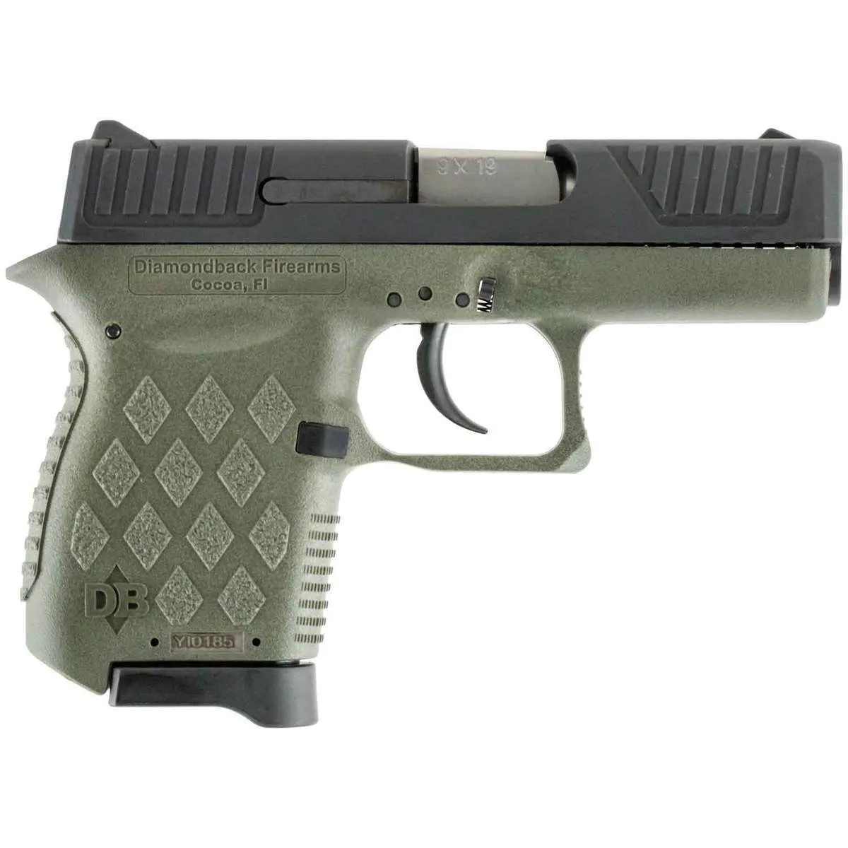 The Diamondback DB9 Semi Automatic Handgun is the ultimate pocket pistol for concealed carry enthusiasts. Featuring a 3-inch barrel, a durable lightweight polymer frame with an Olive Drab Green Cerakote finish, and a sleek matte black slide, this micro-compact pistol offers excellent durability and corrosion resistance. Chambered in 9mm Luger with a 6+1 capacity, the DB9 incorporates a ‘ZERO-Energy’ striker firing system with a mechanical firing pin block for enhanced safety. Designed for reliability and ease of use, the DB9 comes with adjustable rear sights, a 4.25-inch sight radius, and a crisp 5.5-pound trigger pull. Weighing only 11 ounces, this handgun is a top contender for personal protection and concealed carry.