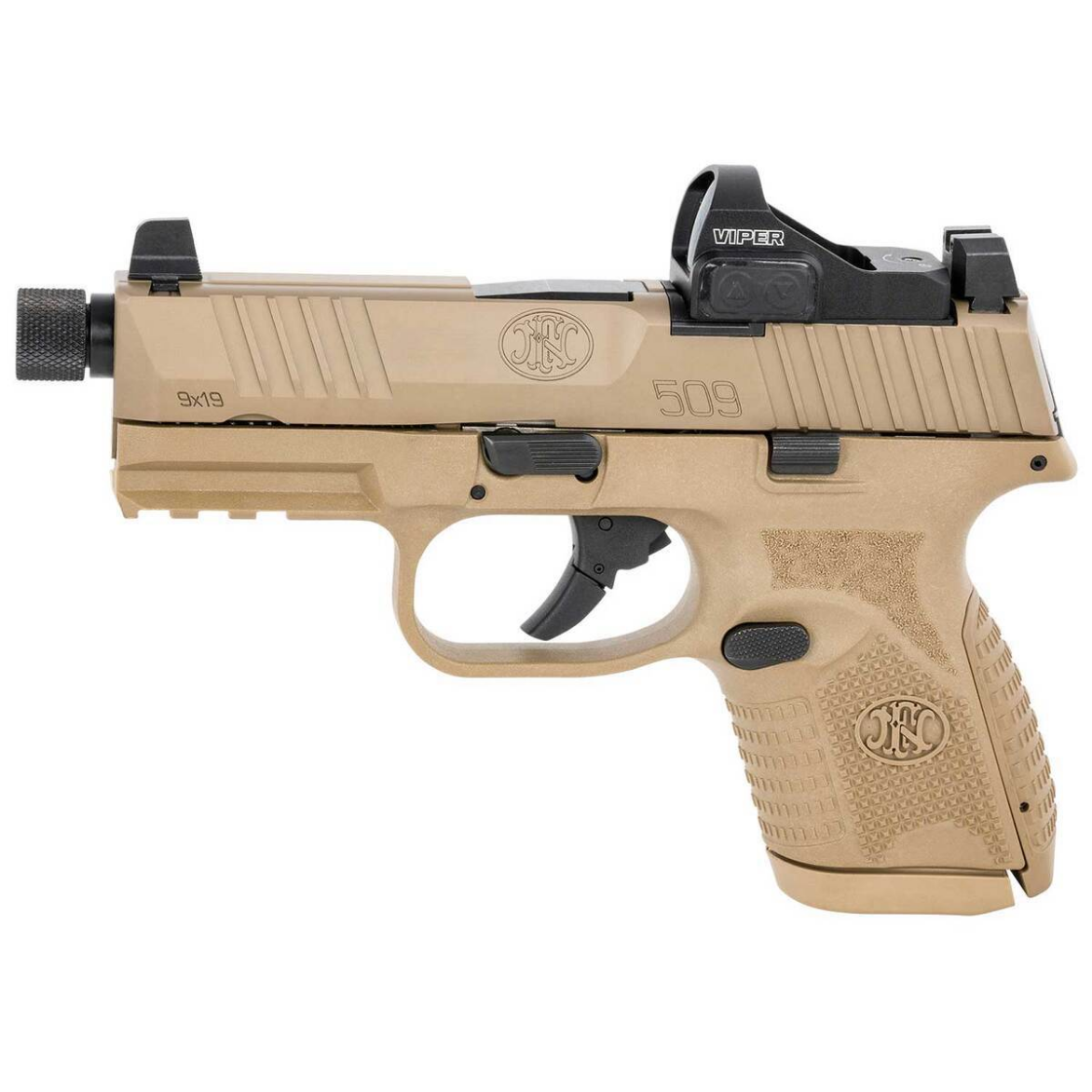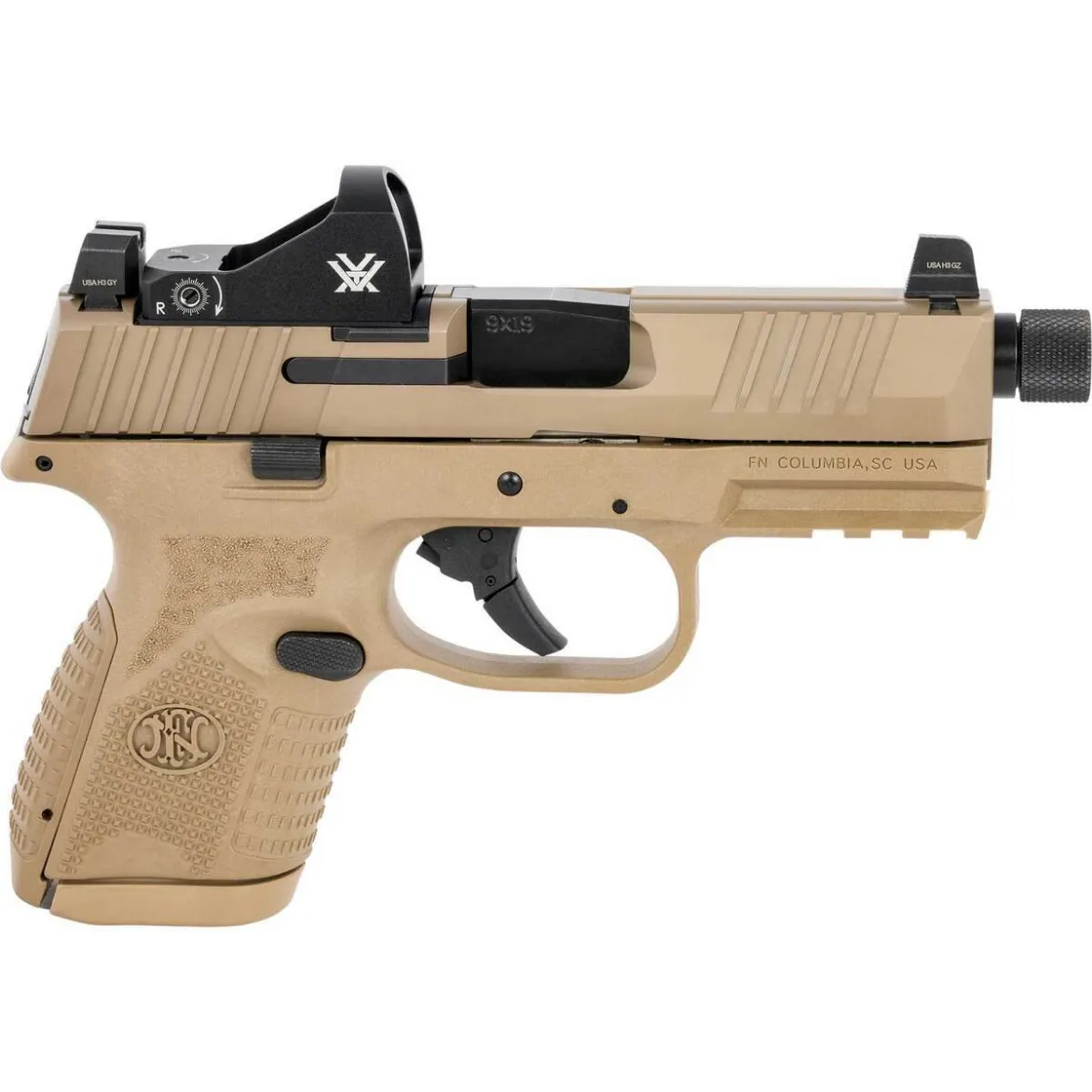 The FN 509 Compact Tactical 9mm Luger pistol delivers full-size performance in a compact package. Equipped with FN’s patented Low-Profile Optics Mounting System, this firearm is highly modular and compatible with nearly all commercial miniature red dot optics. Featuring a 4.32-inch threaded barrel and blackout iron sights for co-witnessing, the 509 Compact Tactical stands out for its durability and precision. With a 10+1 round capacity and the capability to accept larger FN 509 magazines, this compact pistol is perfect for concealed carry or tactical applications. A Flat Dark Earth finish and textured polymer grips complete its stylish, functional design.