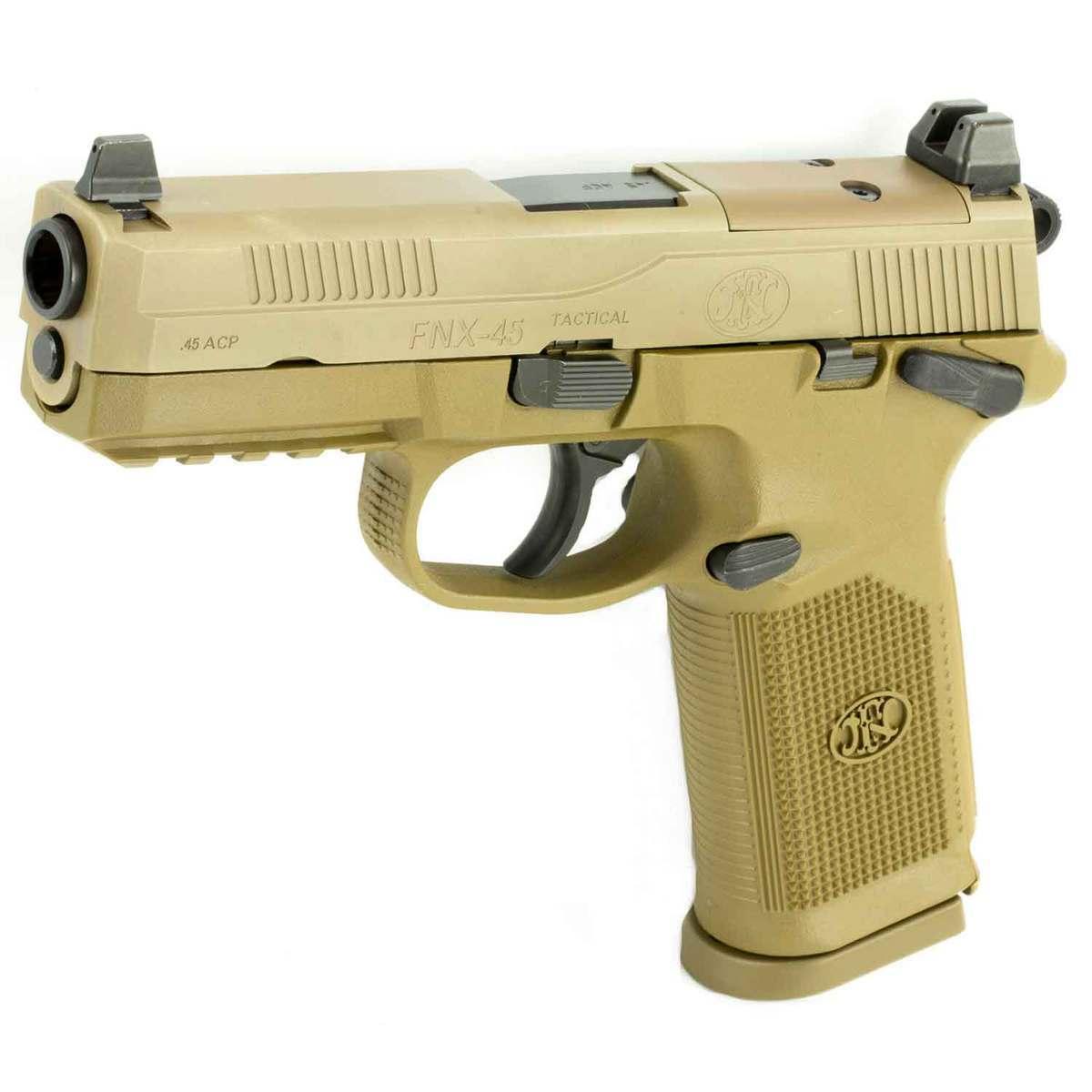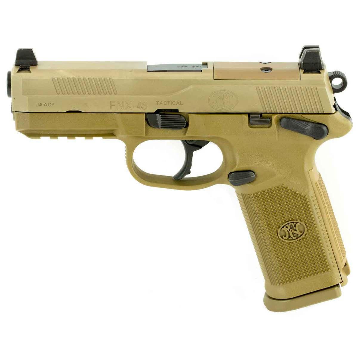The FN FNX-45 Tactical .45 Auto (ACP) pistol is a battle-ready handgun designed for superior performance in demanding conditions. Developed from the FNP-45 Tactical for the U.S. Joint Combat Pistol Program, it combines rugged reliability with cutting-edge engineering. Featuring a flat dark earth (FDE) finish, raised night sights, and a 5.3-inch barrel, this tactical pistol ensures precision and durability. With its 10+1 round capacity and lightweight polymer grips, it is an ideal choice for professionals and enthusiasts alike. Includes two magazines.