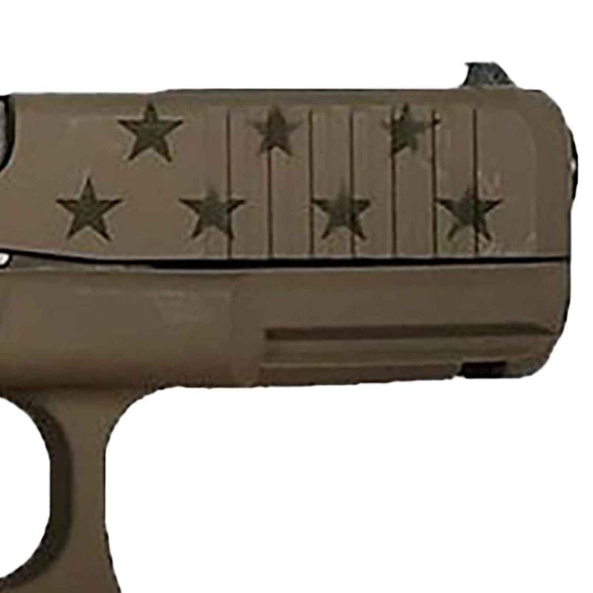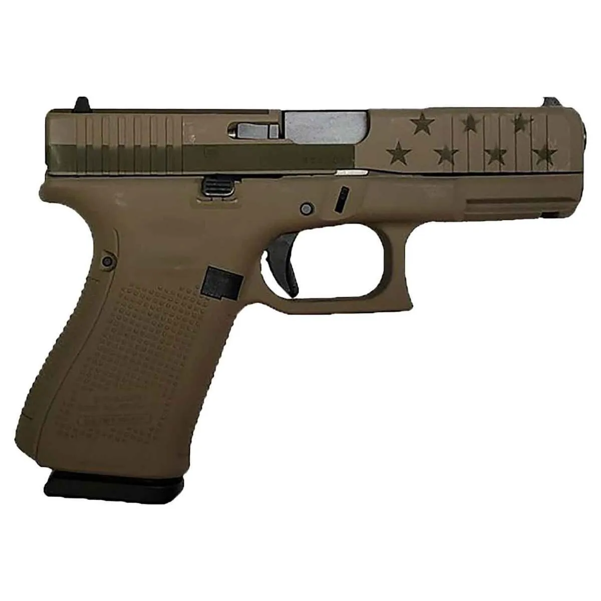 The Glock 19 Gen5 in 9mm Luger is a versatile, compact pistol ideal for various applications. It features a redesigned frame with customizable grip options, ambidextrous controls, and enhanced barrel precision for improved accuracy. The Flag Cerakote finish adds durability and a bold aesthetic appeal.