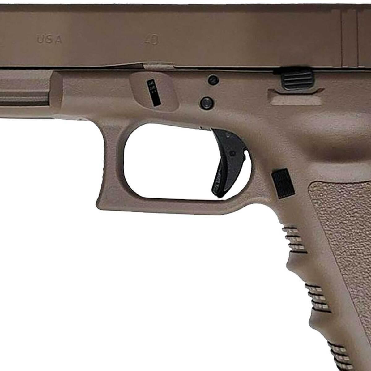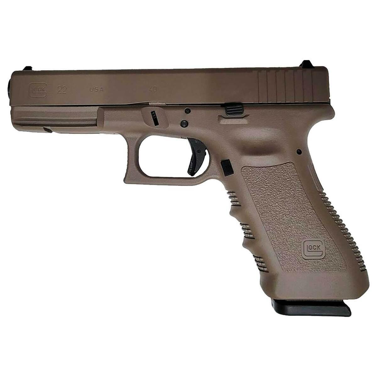 The Glock 22 Gen3 in .40 S&W caliber is a full-size pistol trusted by law enforcement agencies across the United States and beyond. Designed for reliability and performance, this handgun features a 4.49-inch cold-hammer-forged barrel, ensuring uniform precision. The Flat Dark Earth Cerakote finish enhances durability and aesthetics, while the double-action trigger delivers consistent performance. Equipped with Glock’s signature safety mechanisms, including trigger safety, firing pin safety, and drop safety, this firearm provides unmatched security. With a generous 15+1 capacity and two included 15-round magazines, this pistol offers superior firepower. Accessories such as a plastic gun case, gun lock, cleaning rod, and magazine loader add to the package, making the Glock 22 Gen3 a perfect choice for professionals and enthusiasts alike.