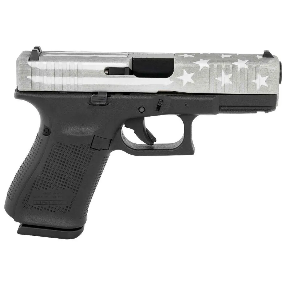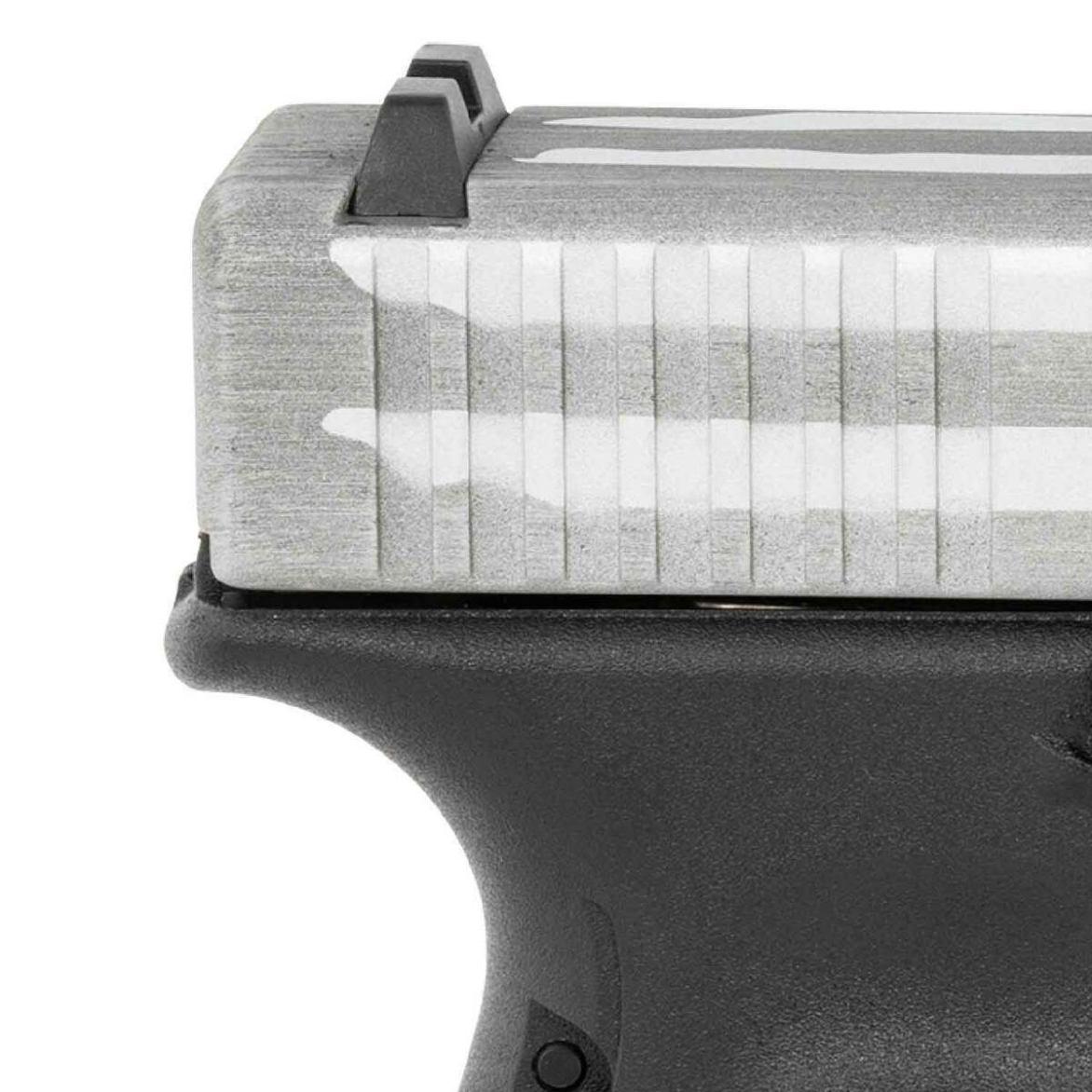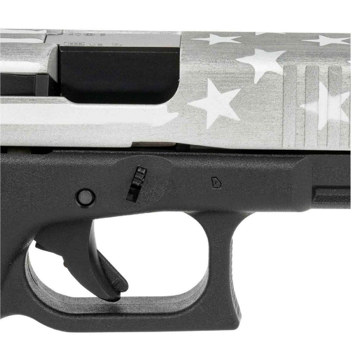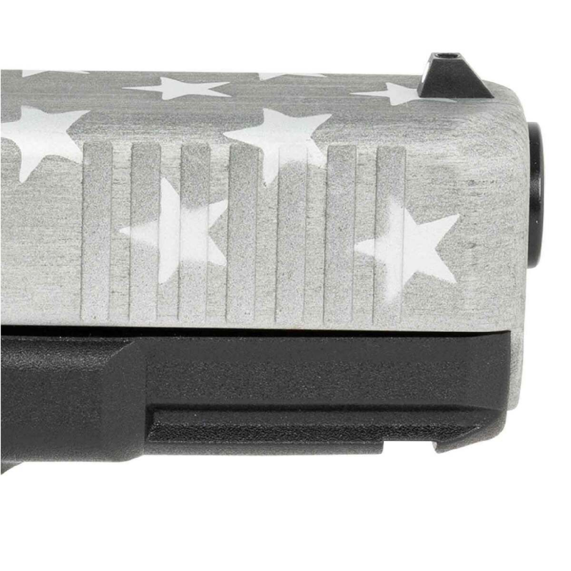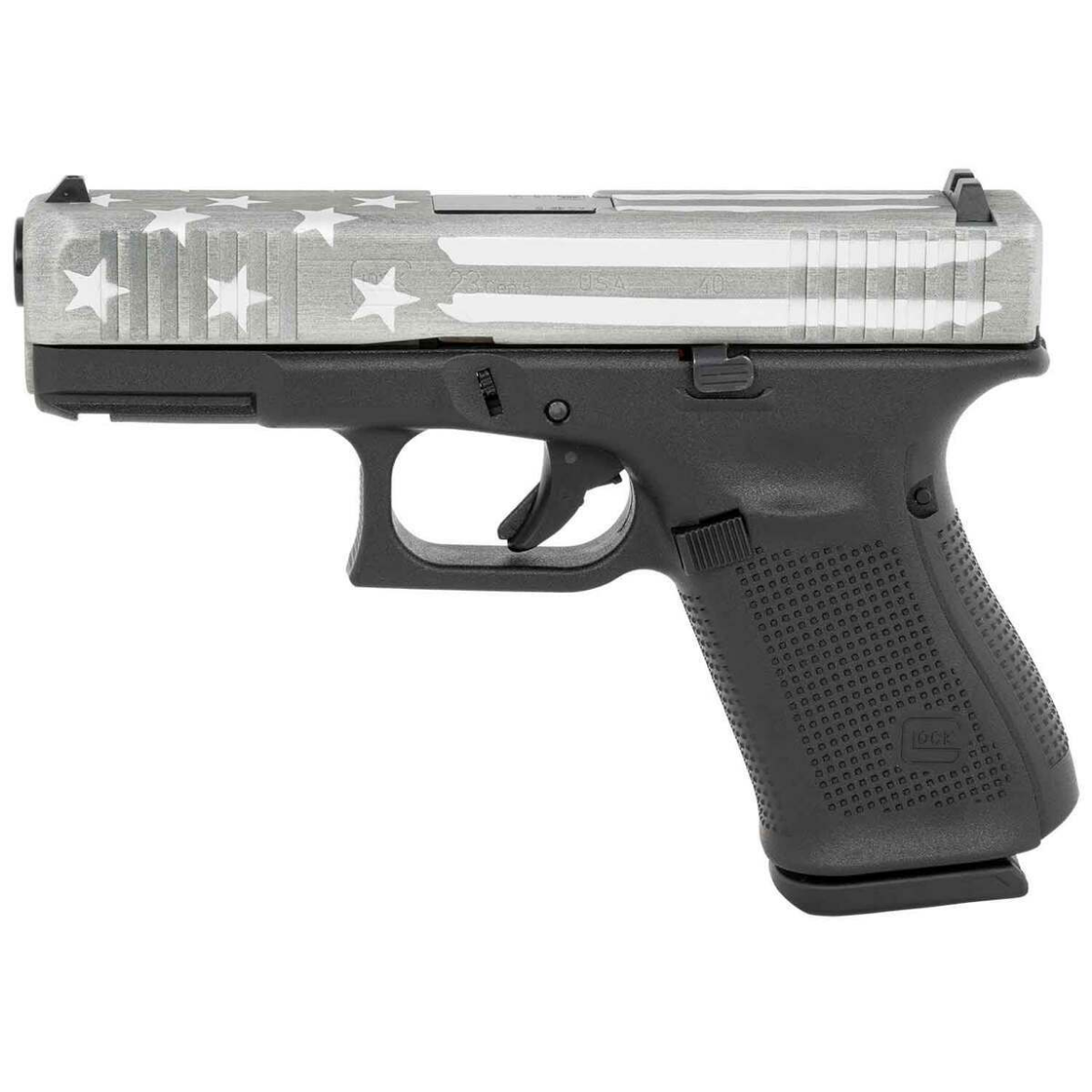 The Glock G23 Gen5 Compact is a reliable and versatile handgun chambered in 40 S&W with a compact frame and 4.02-inch barrel. Its black and gray battle-worn flag Cerakote finish is both durable and visually striking. Engineered for optimal performance, it features Glock’s Safe Action System with three independent safeties for maximum security. The polymer frame with hardened steel guides is lightweight yet robust, offering an ideal grip angle and superb handling. Advanced surface treatments on the slide and barrel ensure long-lasting corrosion resistance even in harsh environments, including saltwater. With a reversible magazine catch, ambidextrous slide stop lever, and interchangeable backstraps, the gun is highly customizable for user preferences. Additionally, the cold-hammer forged barrel delivers exceptional durability, while the loaded chamber indicator adds an extra layer of safety and compliance with specific state laws. The G23 Gen5 is an excellent choice for concealed carry, personal protection, or as a dependable duty firearm.