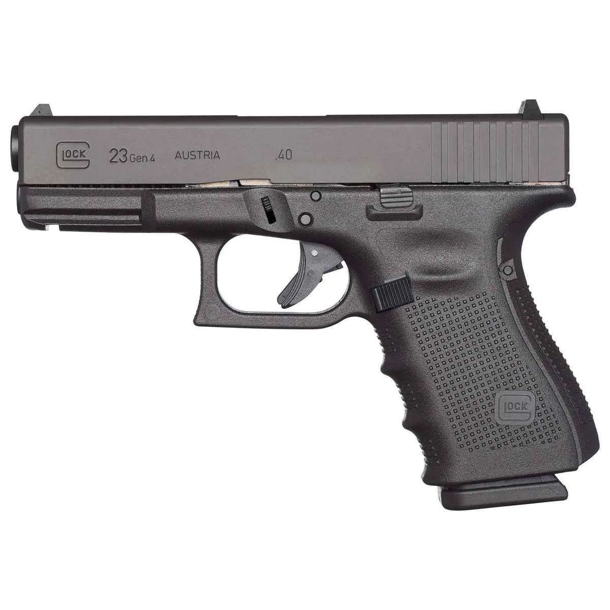 The Glock 23 Gen4 in 40 S&W offers a perfect balance between compact dimensions for both open and concealed carry combined with a lightweight frame and impressive 13+1 round capacity. Its revolutionary modular back strap design ensures a personalized fit for any hand size. Featuring the Gen4 rough textured frame, dual recoil spring assembly for enhanced durability, and a reversible magazine catch suitable for both right- and left-handed users, this compact powerhouse delivers reliability and performance. Equipped with fixed sights, a Glock accessory rail for attachments, and a durable black polymer frame, the Glock 23 Gen4 is the ideal handgun for personal defense, tactical applications, or everyday carry.