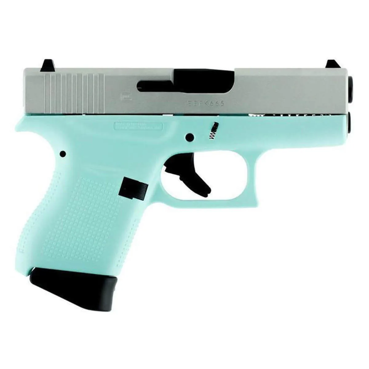 The Glock G43 is the epitome of everyday carry pistols, offering exceptional concealability and reliable performance. Chambered in 9mm Luger, this subcompact handgun features a unique Robin Egg Blue Cerakote finish. With its slimline design and a 6+1 round single-stack magazine, the G43 is perfect for those seeking maximum control and comfort. It boasts a built-in beavertail grip for a secure hold, even during rapid operation, and the aggressive grip texture ensures steady handling. Engineered to the same rigorous standards as other Glock pistols, the G43 stands up to extreme conditions and demanding use. Featuring Glock’s Safe Action System with three independent safeties, cold hammer-forged barrels, and a durable polymer frame, this lightweight 17.99oz pistol is ideal for concealed carry and self-defense. Dimensions include an overall length of 6.26 inches, a compact 3.41-inch barrel, and a width of just 1.06 inches. Whether you’re an experienced shooter or a beginner, the Glock G43 delivers unmatched reliability and performance in a stylish, ergonomic package.