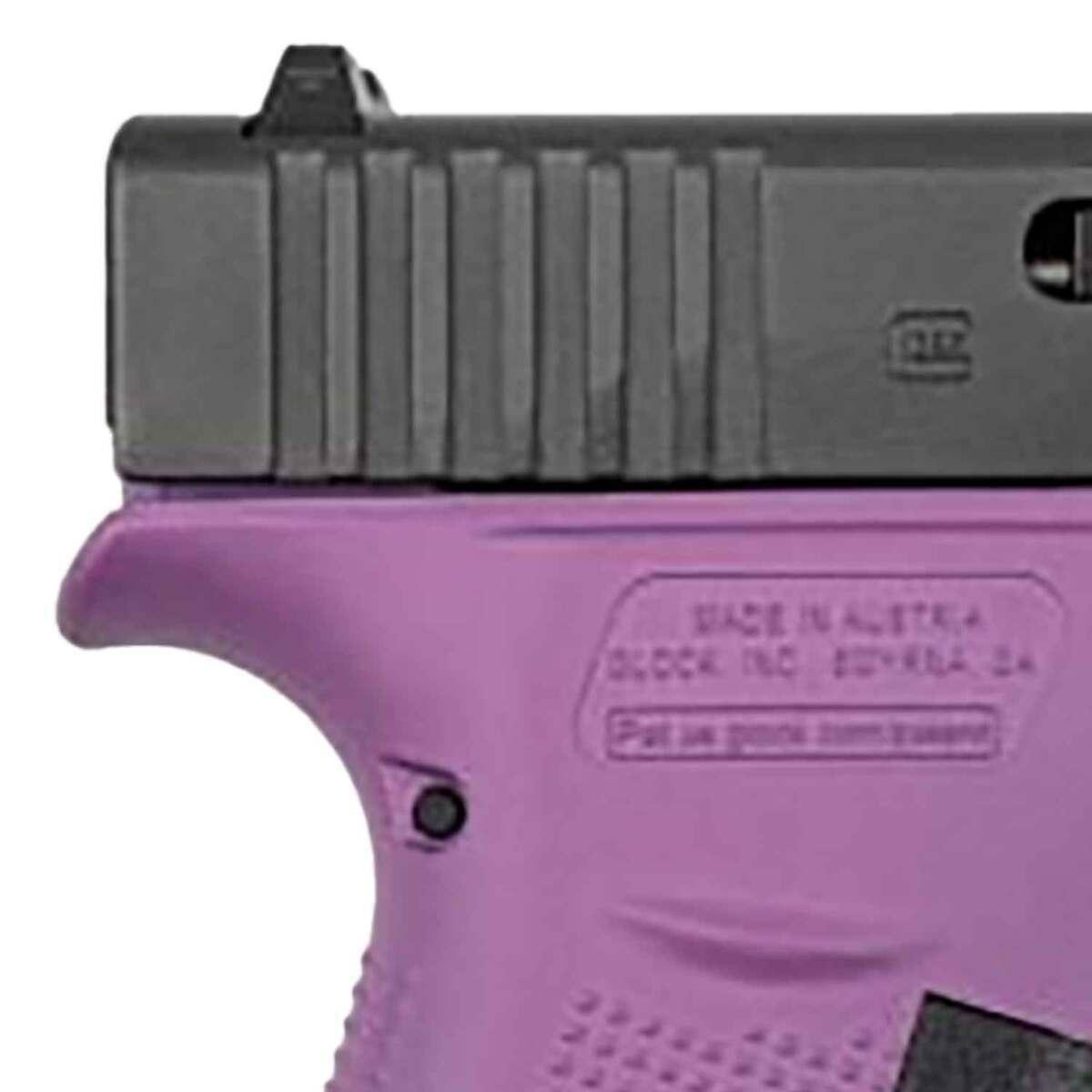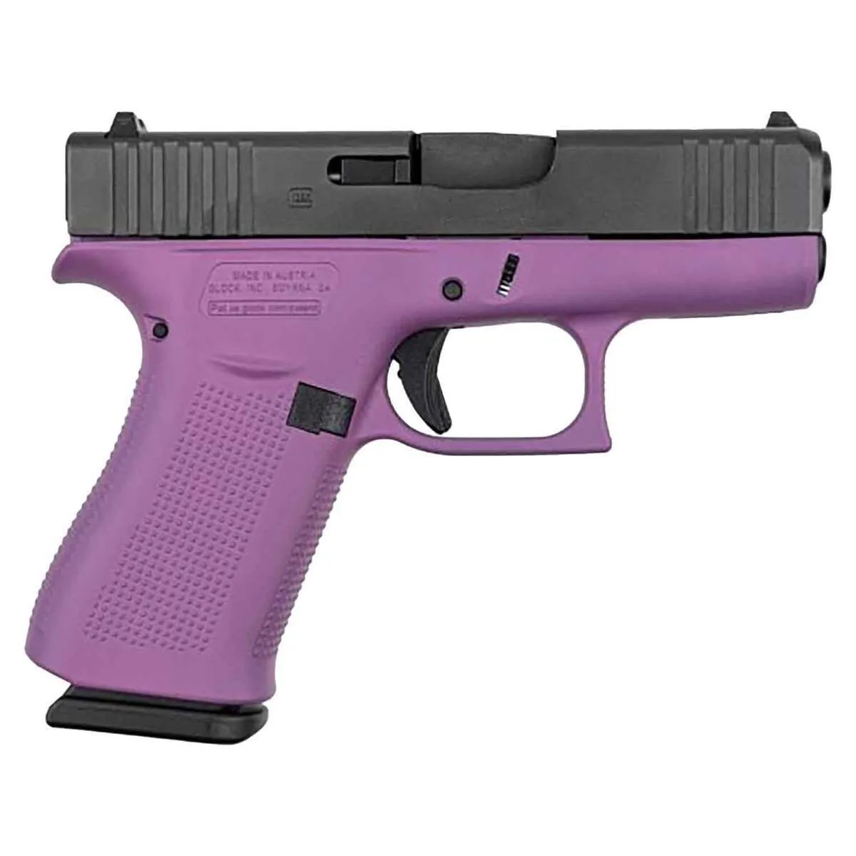 The Glock 43X 9mm Luger Pistol in Wild Purple and Black Cerakote finish is the ideal concealed carry firearm. Featuring a compact Slimline frame with nDLC coating, its 10-round magazine capacity is perfect for those seeking a reliable and portable handgun. Equipped with a match-grade Glock Marksman Barrel (GMB) and precision-milled front serrations, it delivers exceptional accuracy. The ergonomic design includes a compact-size grip length, built-in beavertail, and subcompact-slim slide, ensuring a comfortable and balanced user experience. Additional enhancements such as a reversible magazine catch and Gen 5-inspired elements make this pistol versatile and suited for a wide range of users.