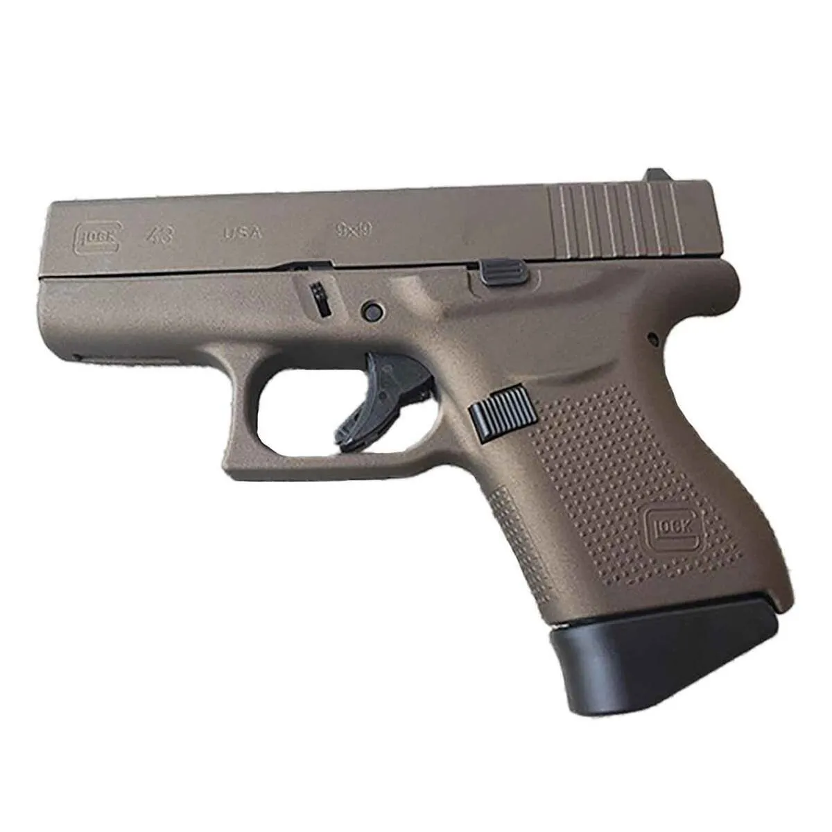 The Glock 43 is a compact 9mm semi-automatic pistol renowned for its reliability and slim design, making it ideal for everyday carry or personal defense. Featuring a striking Midnight Bronze Cerakote finish, fixed sights, and a lightweight build of 17.95 ounces, this durable firearm offers precision and performance in a sleek ergonomic profile.