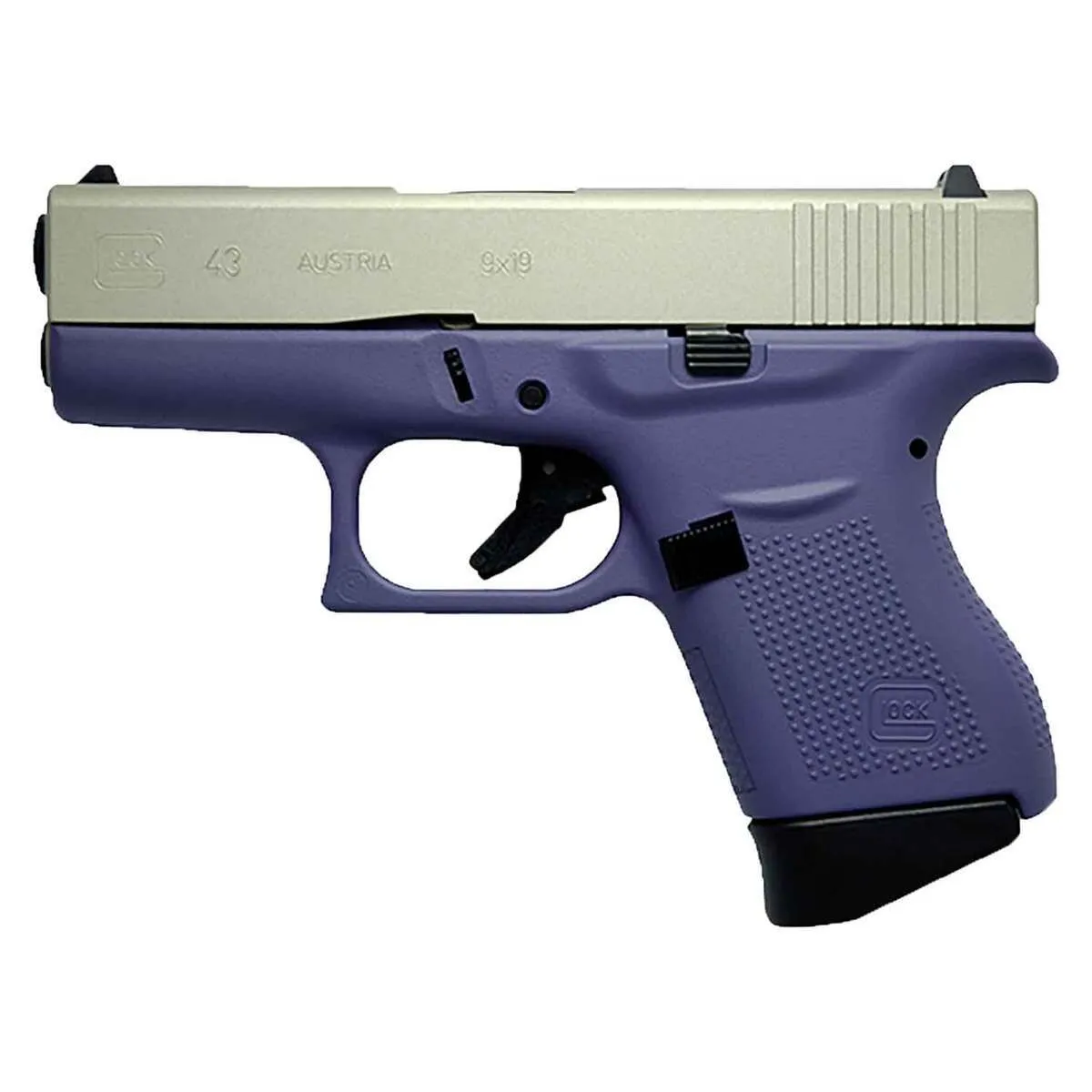 The Glock 43 9mm Luger is an ultra-concealable, single-stack pistol designed for reliability and versatility. Featuring a 3.39-inch barrel length and an attractive shimmering silver and purple Cerakote finish, this subcompact handgun delivers exceptional accuracy and ease of handling. The firearm is equipped with a grip featuring a built-in beaver tail design that allows for a high, secure grip, while the aggressive texture ensures comfortable yet firm operation. Its large magazine catch facilitates quick removal of the six-round magazine, making it ideal for personal defense or concealed carry. Engineered to uphold Glock’s legendary durability and subjected to rigorous torture tests, the Glock 43 is a premium choice for shooters seeking reliability in a stylish, compact package.