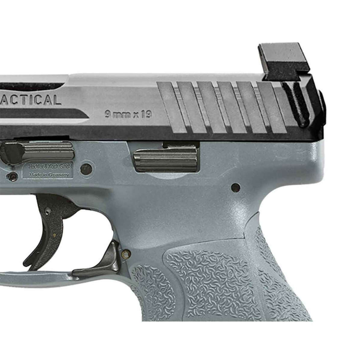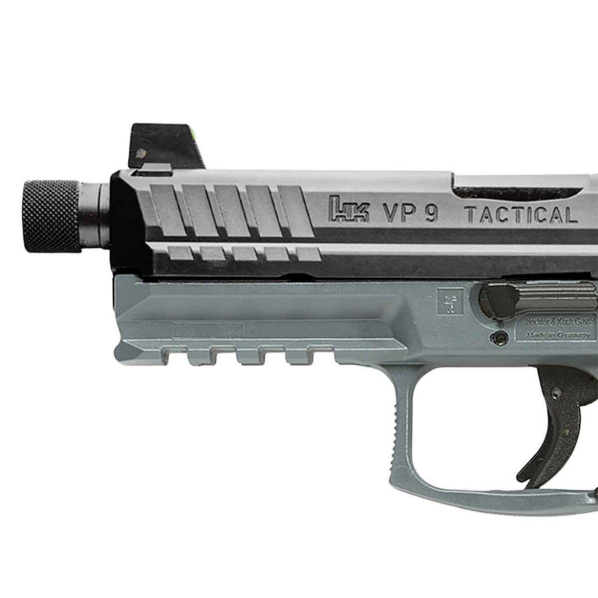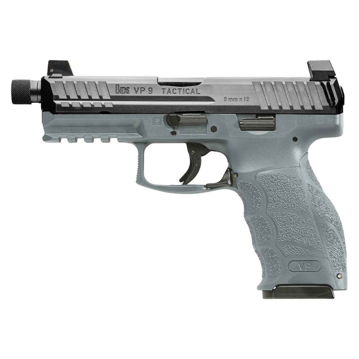 The HK VP9 Tactical 9mm Luger 4.7in Gray Pistol delivers exceptional performance with top-tier engineering. Featuring HK’s advanced striker firing system paired with their signature ‘light pull’ trigger, this firearm is designed for precision shooting and reliability. The cold hammer-forged barrel, crafted from cannon-grade steel, ensures durability and increased muzzle velocity. The polymer frame integrates an extended Picatinny MIL-STD-1913 rail for seamless mounting of lights or accessories, while the ambidextrous controls enhance functionality for both right- and left-handed users. A standout feature includes HK’s patented rear-mounted charging supports, offering superior grip leverage for slide manipulation. The machined steel slide is treated with HK’s hostile environment finish for maximum corrosion and wear resistance. With additional features like a threaded barrel, fixed front and adjustable rear night sights, and an ergonomic finger-grooved gray grip, the VP9 Tactical is a robust choice for tactical and recreational shooting.