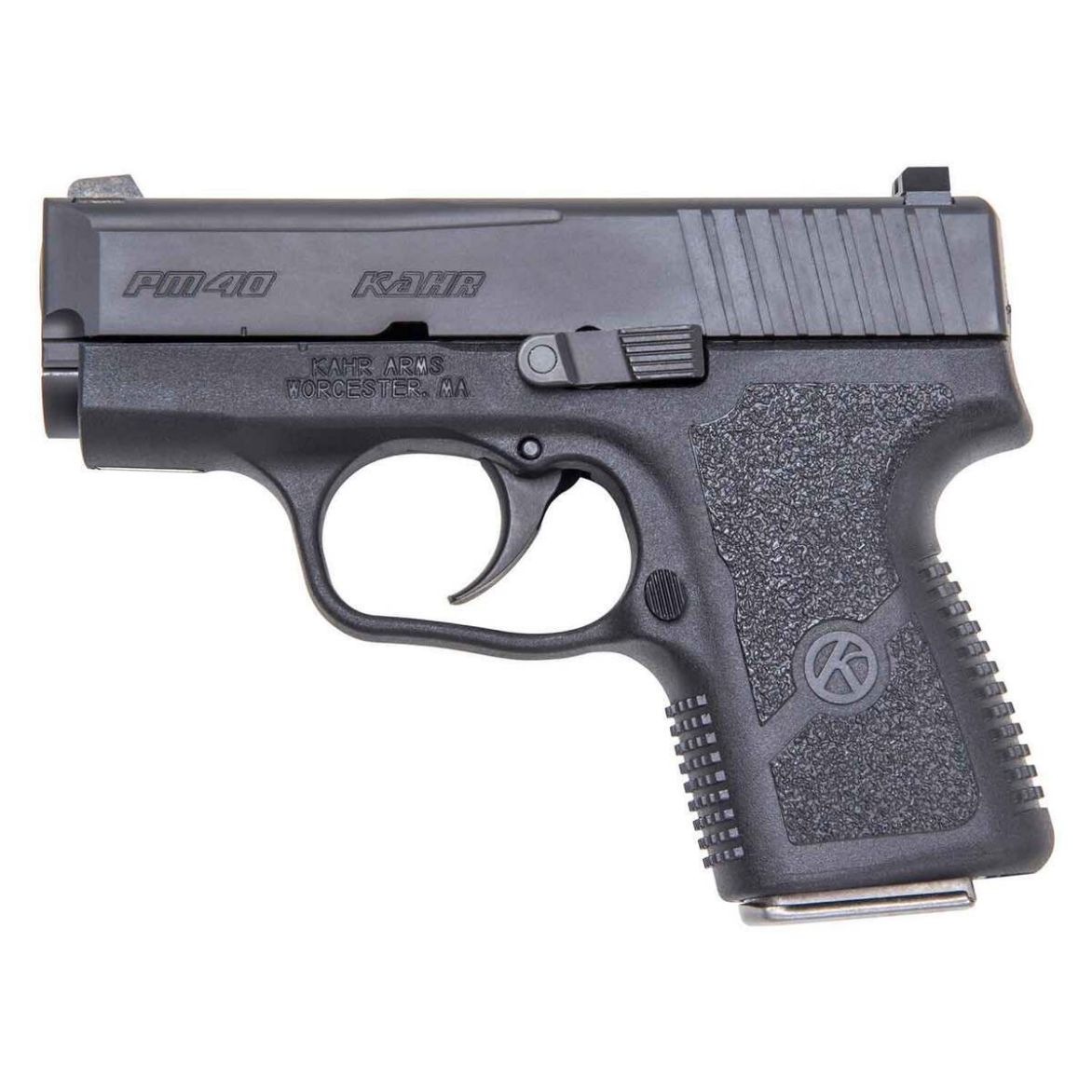The Kahr PM40 in 40 S&W features a compact 3.10-inch Lothar Walther polygonal rifled match grade barrel for exceptional accuracy. Designed for pocket carry, this subcompact handgun offers a thin profile and a smooth DAO trigger for quick, reliable operation. With a matte black finish, textured black polymer grips, and drift adjustable combat sights, the PM40 is built for performance and ease of use. Includes 5+1 round capacity and comes with 3 magazines for enhanced practicality.