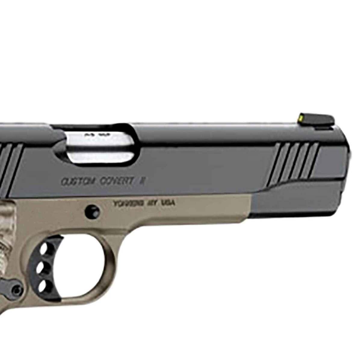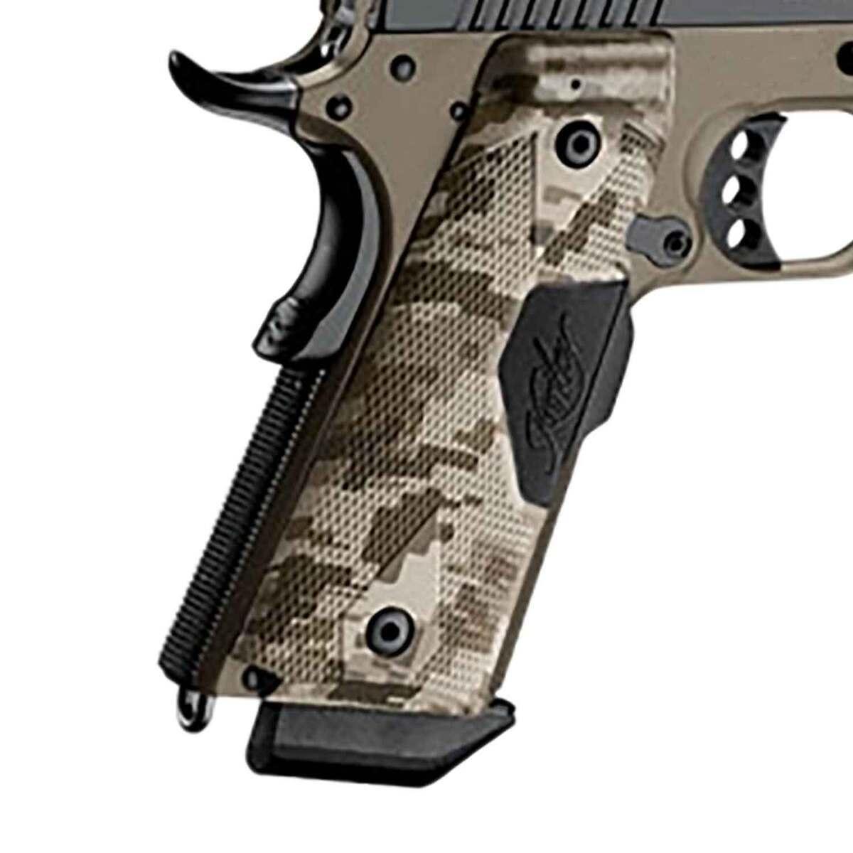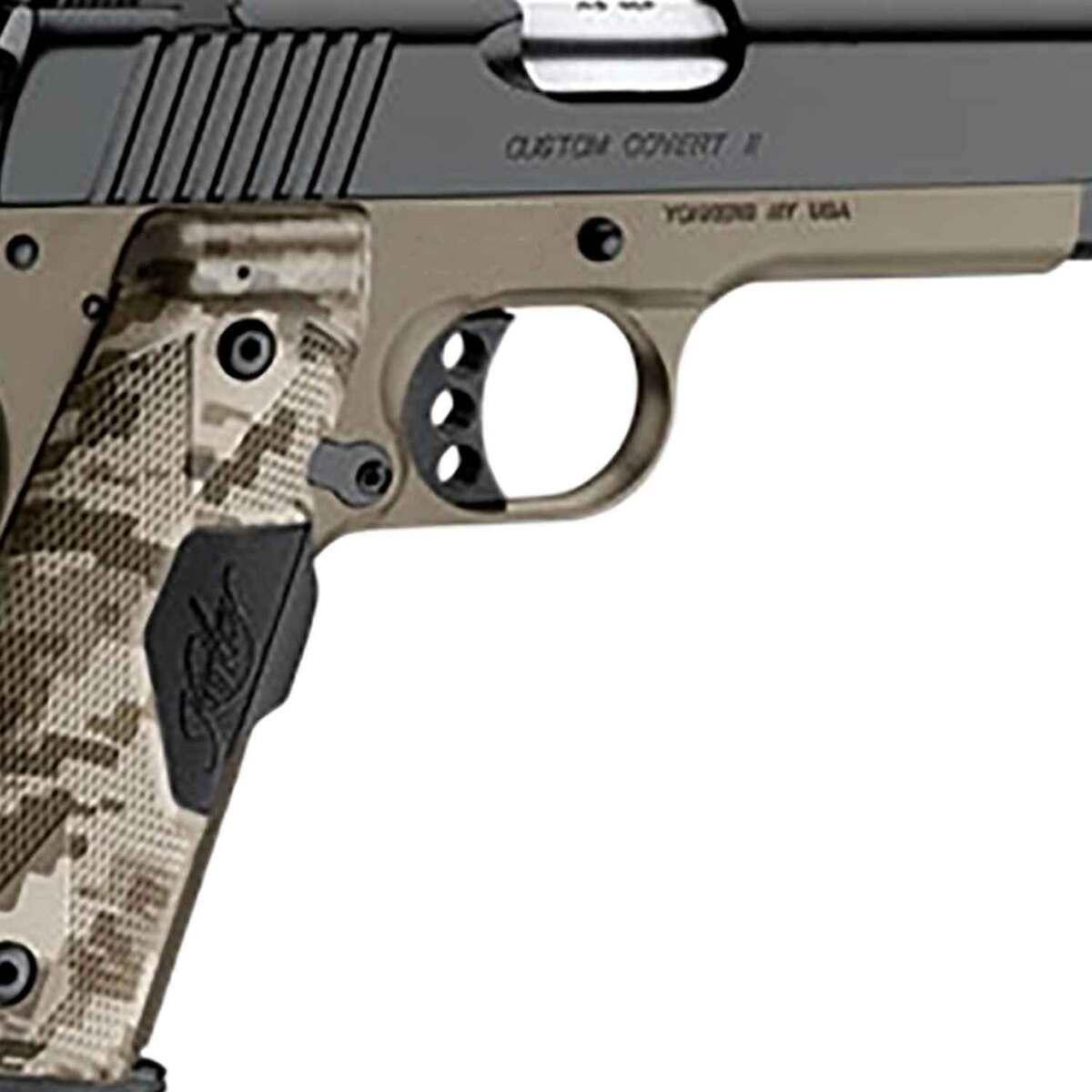 The Kimber Custom Covert II 45 Auto (ACP) Pistol features a lightweight design with practical enhancements for superior performance. It boasts Crimson Trace Lasergrips with urban camouflage, providing precise targeting capabilities, alongside a bumped and grooved beavertail grip safety for reliable handling. With a 5-inch barrel in a refined charcoal gray finish, tactical wedge 3-dot tritium night sights ensure enhanced accuracy in low-light conditions. This centerfire pistol is optimized for concealed carry with a special Carry Melt treatment and precision-machined 30 lines-per-inch front strap checkering, creating an ideal blend of comfort, style, and functionality.