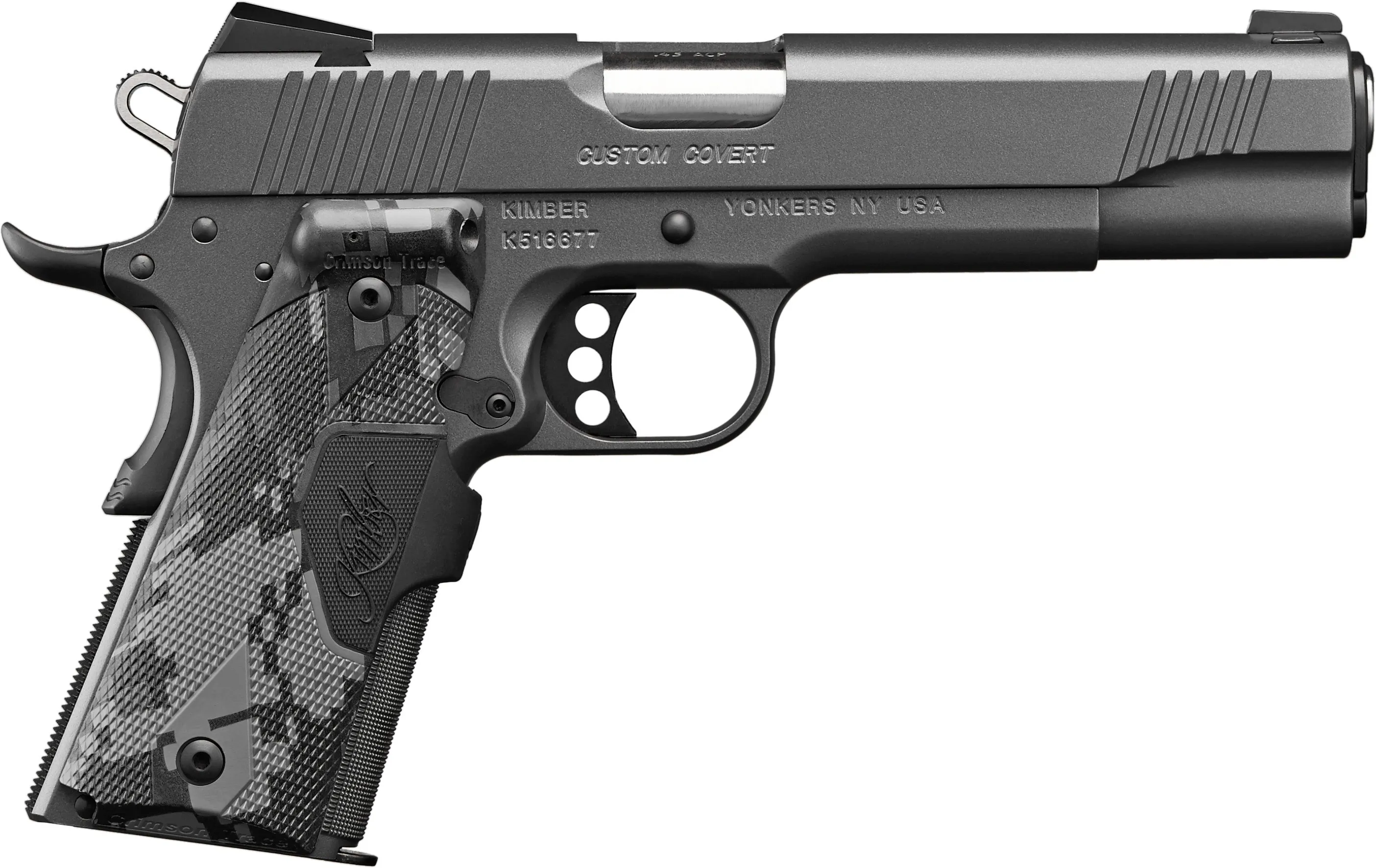 The Kimber Custom Covert is a premium 1911-style semi-auto pistol chambered in .45 ACP, designed for superior performance and sleek aesthetics. It features Urban Camo CT Lasergrips, tactical wedge tritium night sights, and an aluminum frame with a Charcoal Gray KimPro II finish, delivering accuracy, durability, and ergonomic comfort. Perfect for self-defense or competitive shooting, this handgun showcases exceptional craftsmanship and advanced functionality.