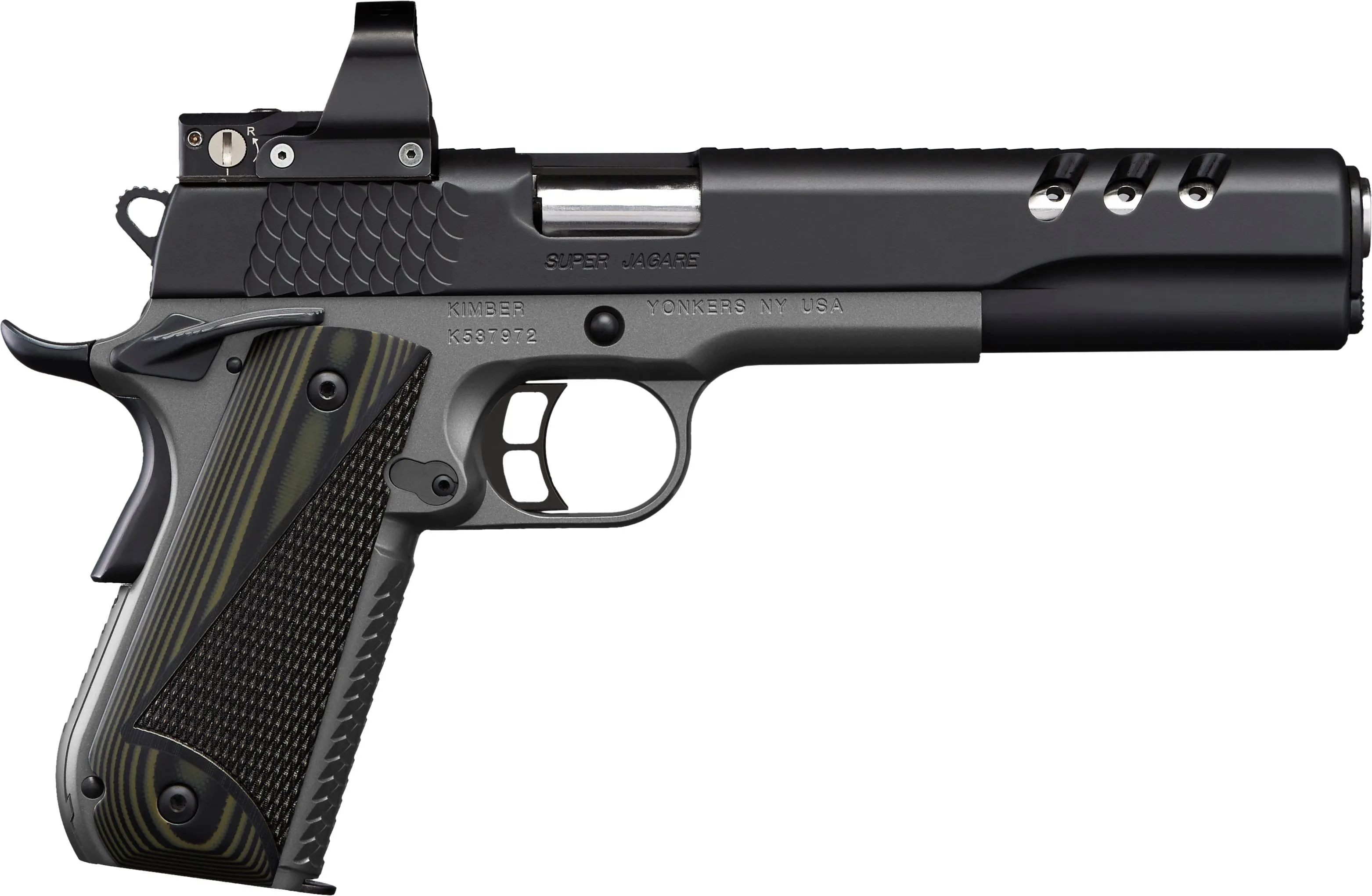 The Kimber Super Jagare is a high-performance 1911-style pistol chambered in 10mm, designed for precision and versatility. Featuring a durable Diamond-Like Carbon Coating, DeltaPoint Pro Optic, and ergonomic Micarta grips, this 6-inch barreled firearm excels in hunting, competition, and self-defense scenarios. Its combination of advanced technology and striking design makes it a premium choice for serious shooters.