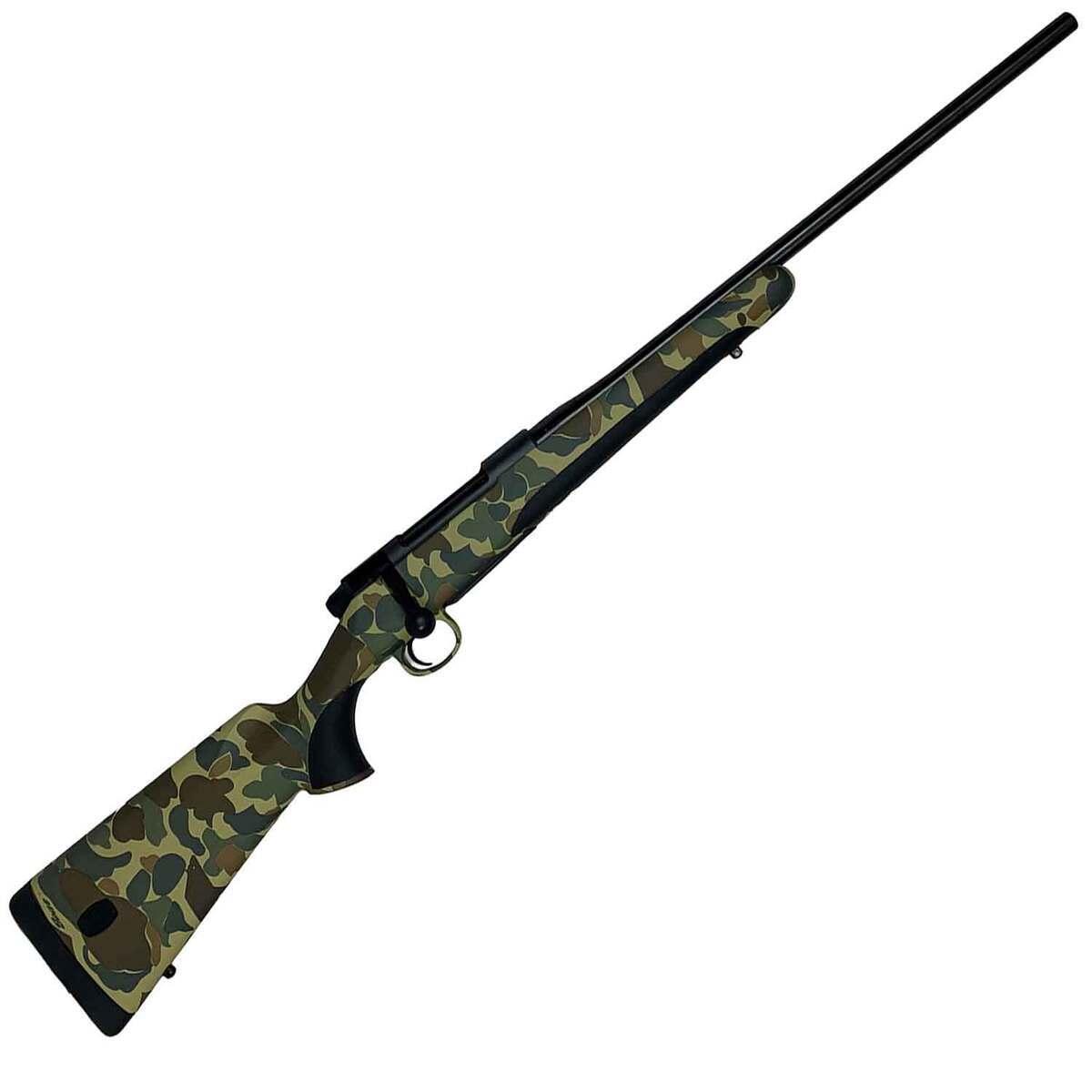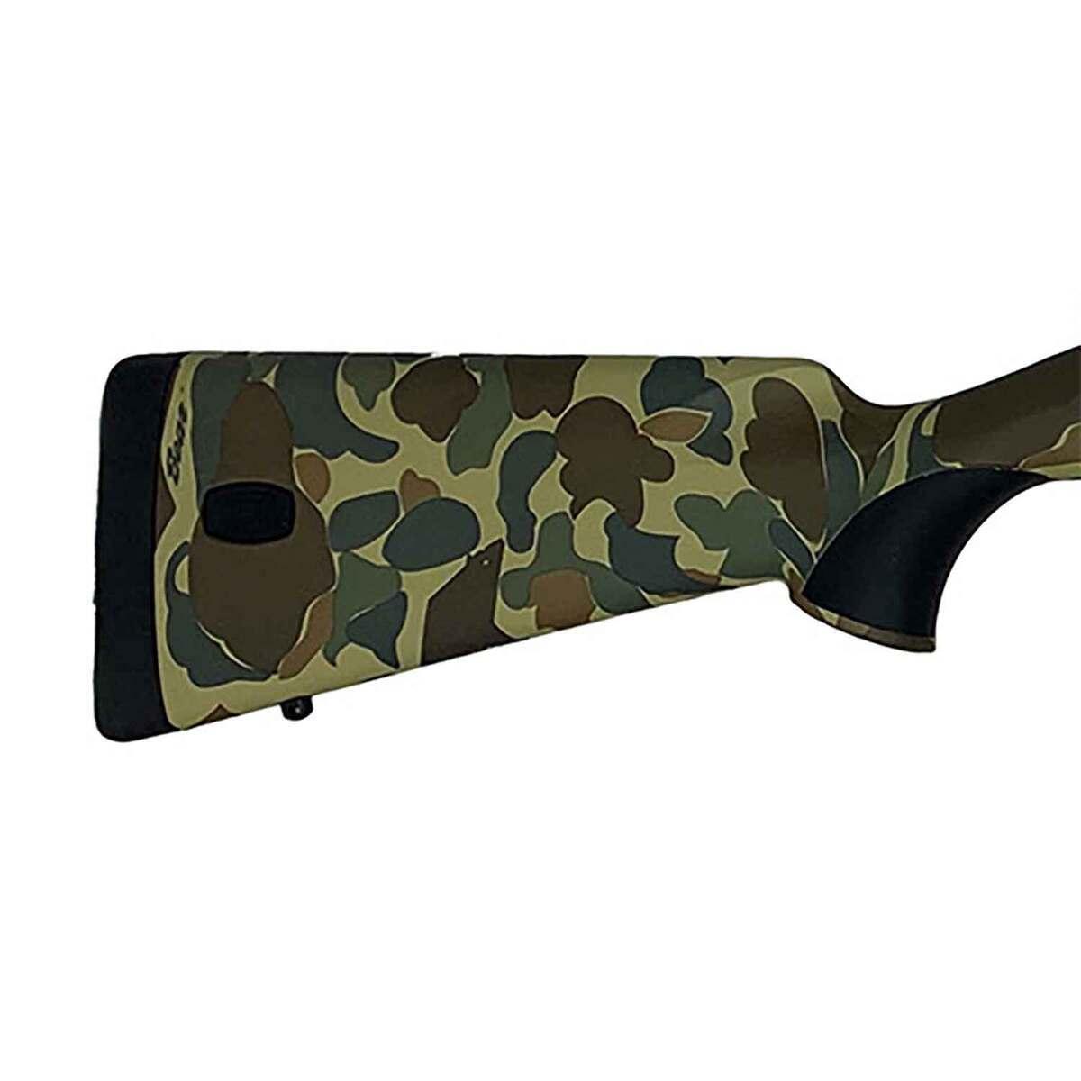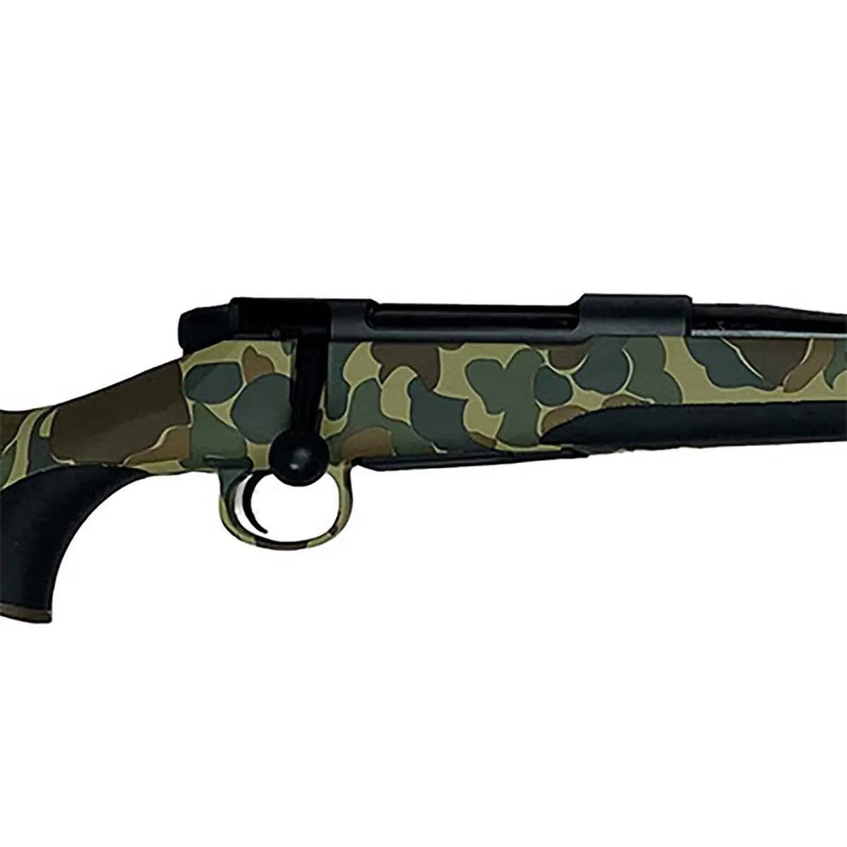 The Mauser M18 Old School Camo Bolt Action Rifle, chambered in 270 Winchester with a 24.4-inch barrel, combines performance and durability. It features an ultra-robust Fred Bear Old School Camo-dipped synthetic stock with soft grip inlays at the pistol grip and fore-end for superior handling. The removable recoil pad offers additional storage space inside the stock. Designed for hunters and precision shooters, this rifle delivers reliability and accuracy in every shot.