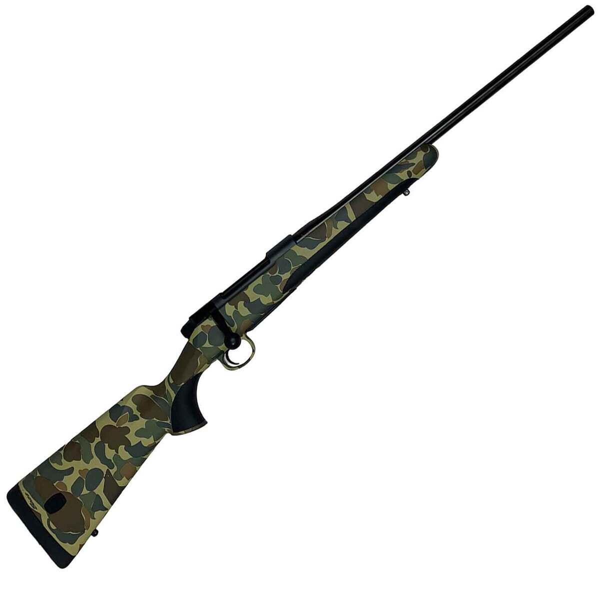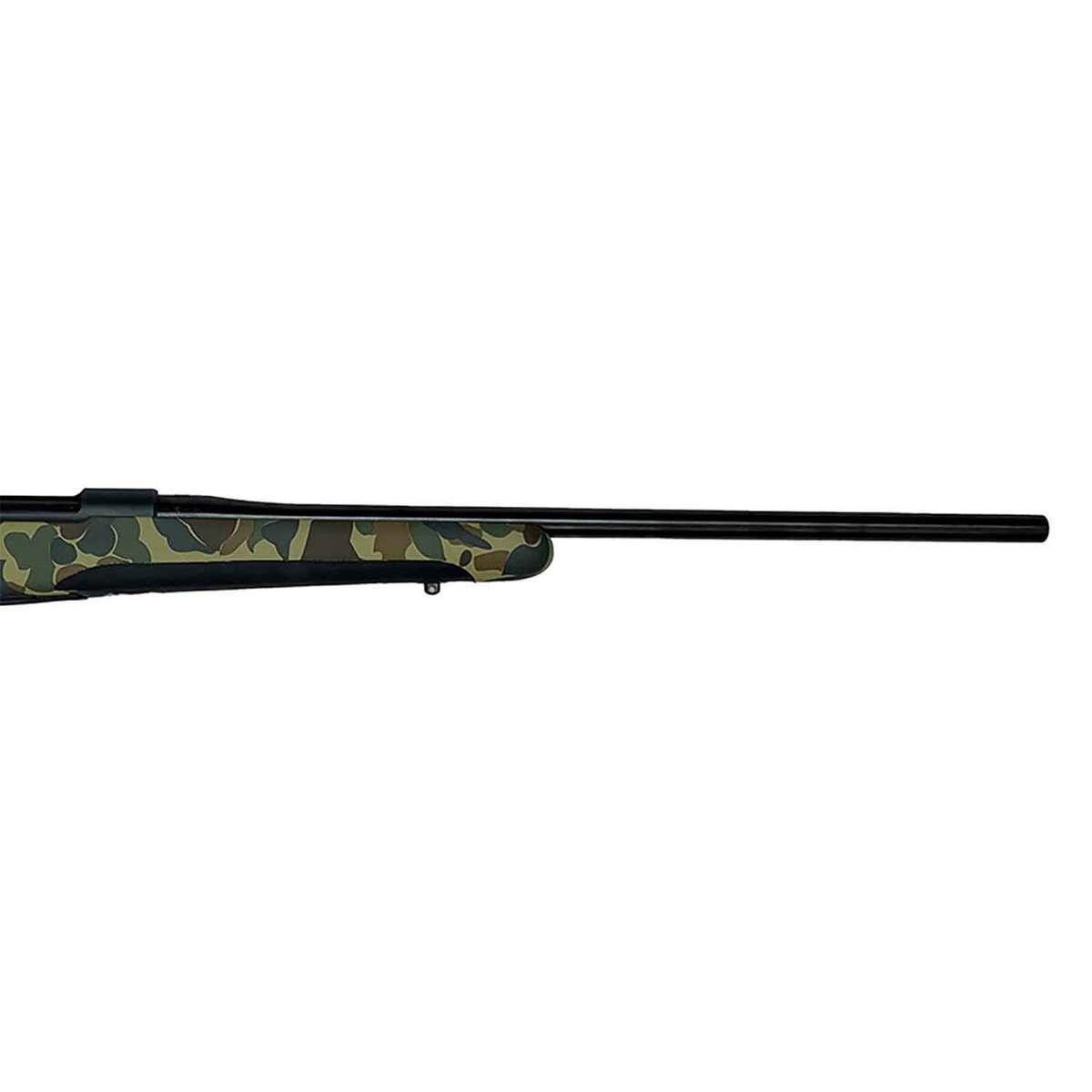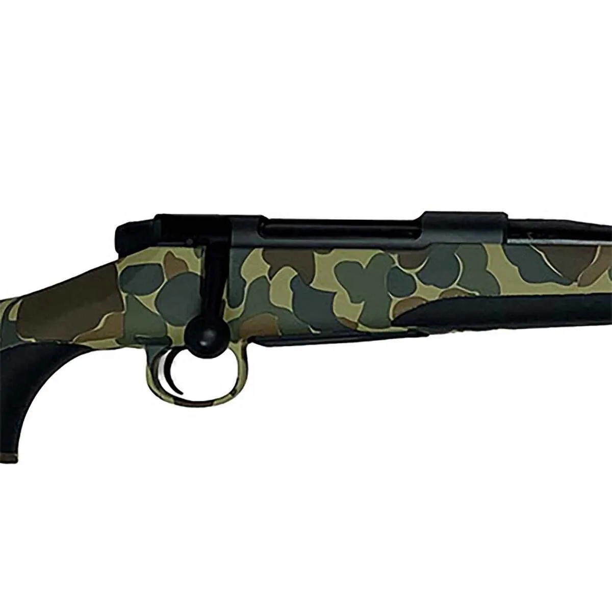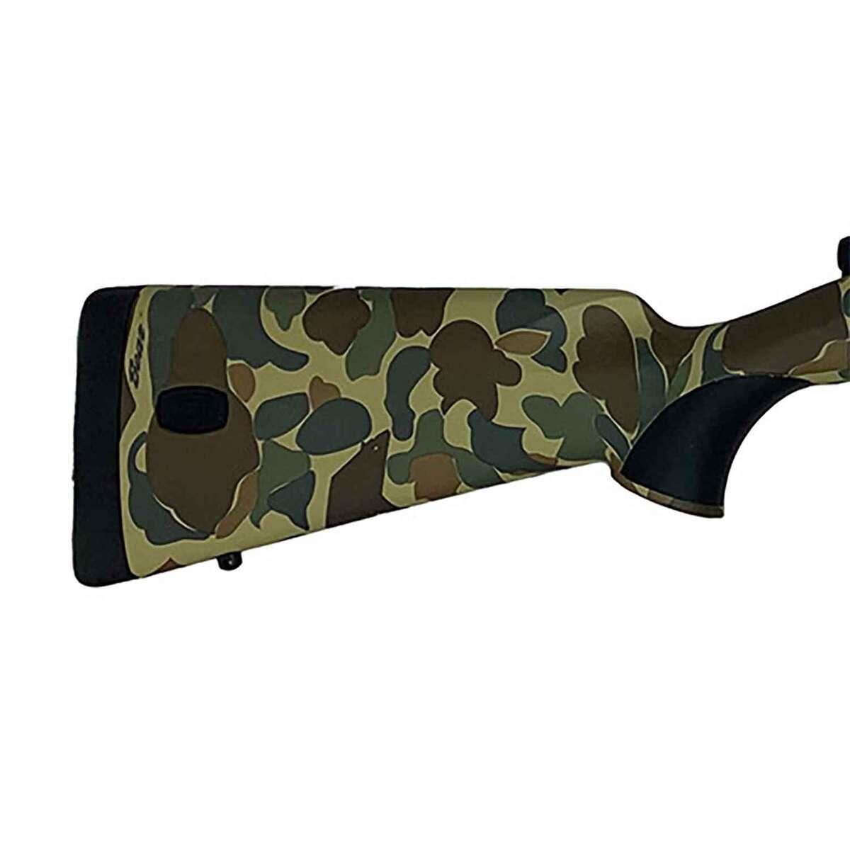 The Mauser M18 Old School Camo Bolt Action Rifle in 30-06 Springfield offers a robust Fred Bear Old School Camo synthetic stock with ergonomic soft grip inlays for superior handling. Featuring a 24.4-inch barrel and a removable recoil pad with built-in storage, this rifle combines precision, power, and practicality, making it ideal for both hunting and target shooting.