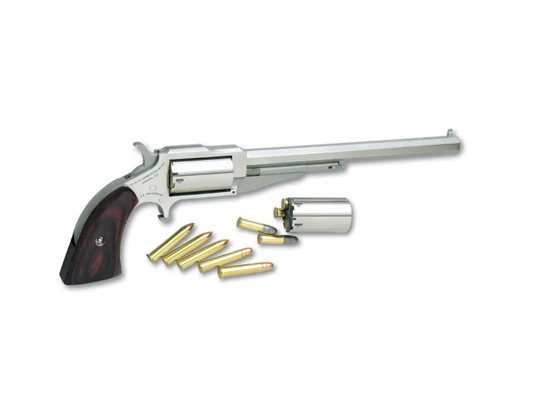 The North American Arms Sheriff Mini-Revolver is a precision-engineered revolver that combines the robust performance of 22 LR and 22 Magnum calibers with the sleek durability of a stainless steel finish. Featuring a 6-inch barrel, a 5-shot single-action design, and fixed sights for reliable accuracy, it is crafted with a steel frame and wood grips for a classic yet sturdy feel. Designed for users seeking portability and high-quality craftsmanship, this revolver offers unmatched versatility in an ultra-lightweight package weighing only 9.7 ounces. Ideal for collectors, outdoor enthusiasts, and those in search of a dependable sidearm, the Sheriff Mini-Revolver delivers function and style in equal measure.