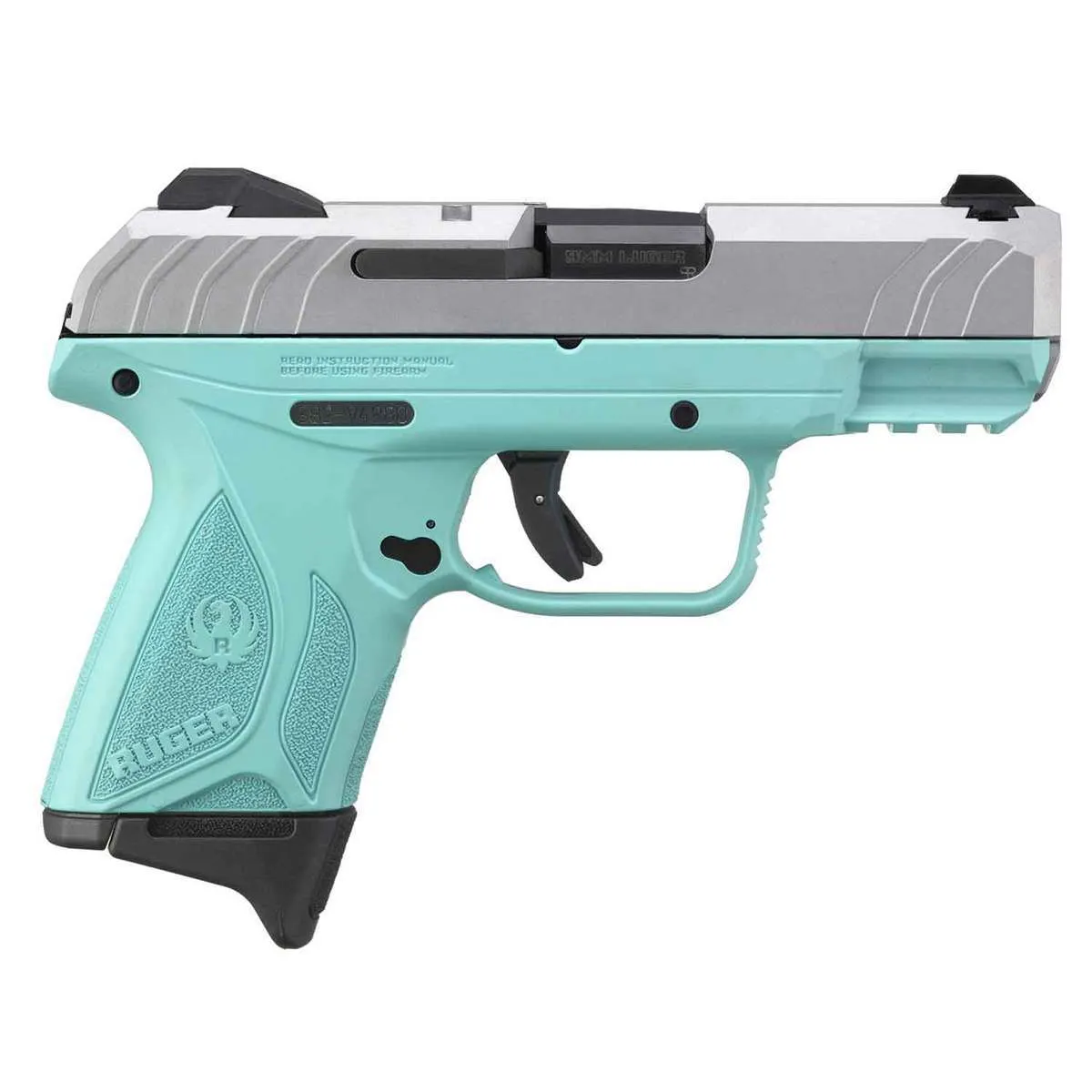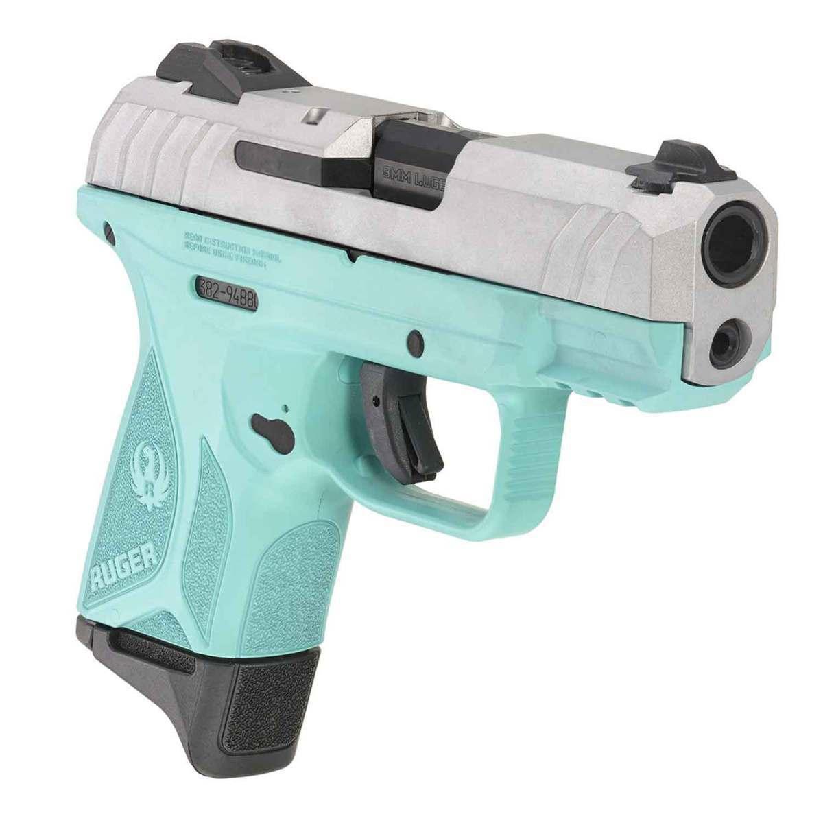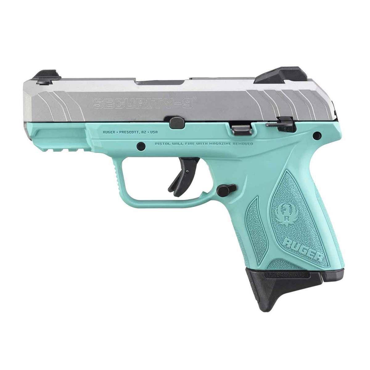The Ruger Security-9 Compact chambered in 9mm Luger features a 3.42-inch barrel and a striking silver Cerakote finish paired with turquoise grips. Designed for both rugged performance and comfort, it boasts a blued, through-hardened alloy steel slide and barrel, along with a high-performance glass-filled nylon grip frame. Its Secure Action system, derived from the proven hammer-fired LCP fire control system, blends a smooth trigger pull with the crisp feel and positive reset of single-action fire control. With a drift-adjustable sight and a compact frame size, this pistol is perfect for concealed carry, range use, or personal defense.