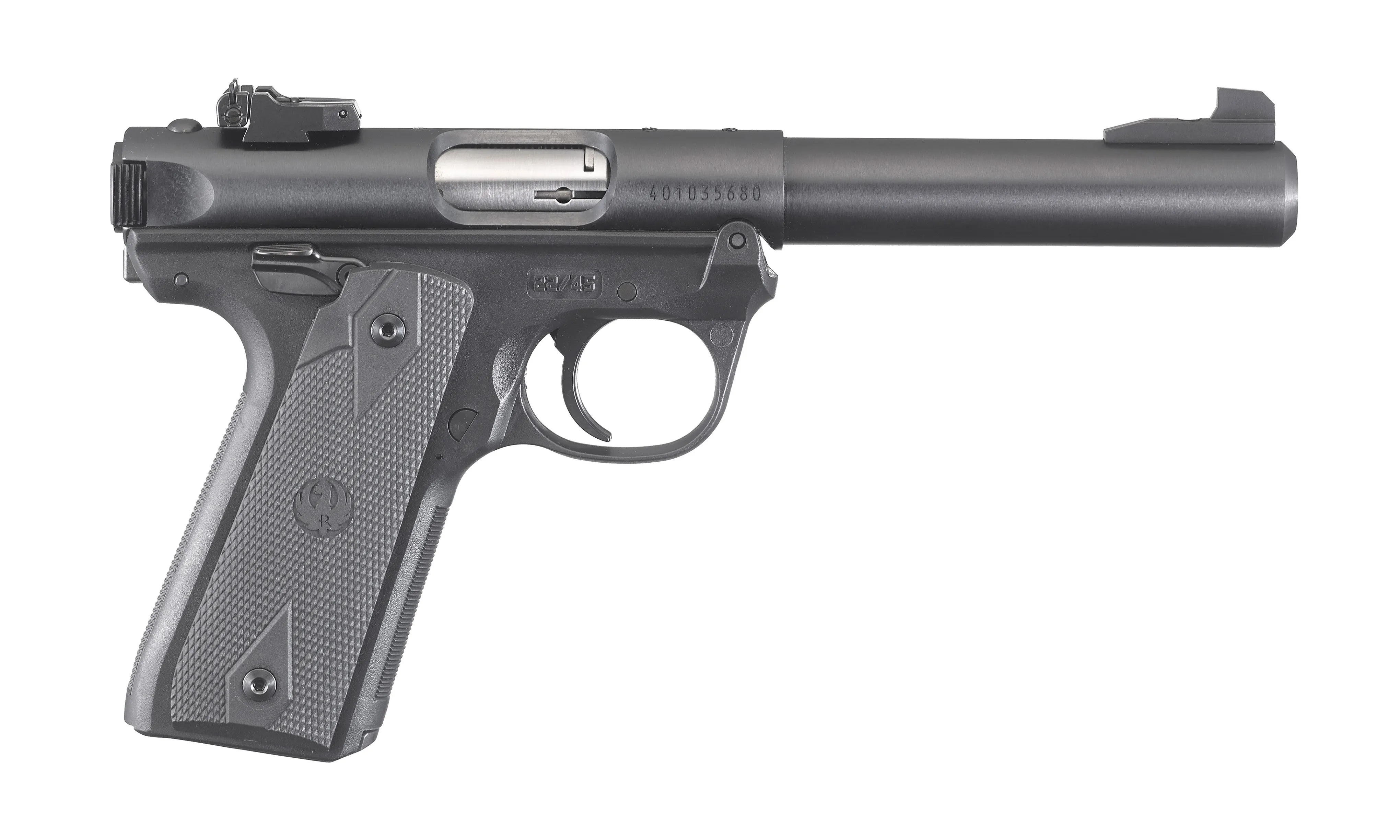 The Ruger Mark IV Target is a high-performance semi-automatic pistol designed for precision and ease of use. Chambered in .22 LR, this firearm features a 5.5-inch bull barrel for exceptional accuracy, a polymer frame with checkered synthetic grips for a secure hold, and a simple one-button takedown system for easy maintenance. Equipped with fixed front and adjustable rear sights, it offers versatility for both target shooting and recreational use. Compliant with California regulations, this pistol includes a magazine disconnect and ships with two 10-round magazines. Built in the USA, the Ruger Mark IV Target is a reliable choice for competitive shooters and firearm enthusiasts alike.