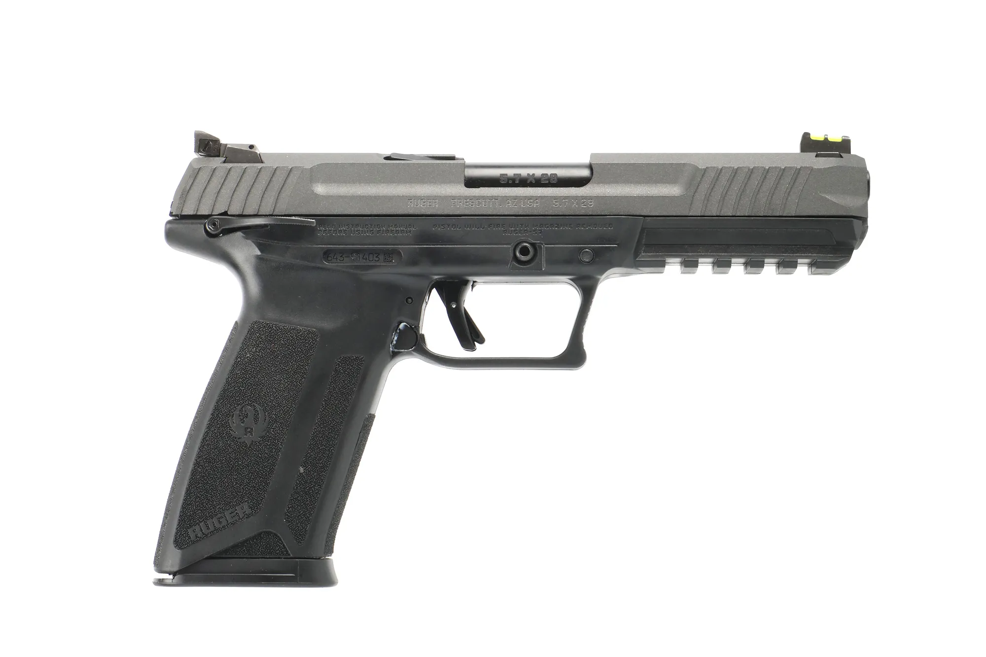 The Ruger-57 Pistol offers cutting-edge performance in a sleek and modern design. Chambered in 5.7 x 28mm, this semi-automatic handgun delivers exceptional accuracy and high-capacity functionality with a 20+1 round capacity. Featuring a cobalt slide finish, fiber optic front sights, adjustable rear sights, and a lightweight polymer frame, this firearm is built for precision and comfort. Additional features include a Picatinny-style accessory rail, reversible magazine release, and a visual inspection port, making it perfect for both tactical and recreational shooting. The Ruger-57 Pistol is an excellent choice for those seeking advanced capabilities and reliability in a compact form factor.