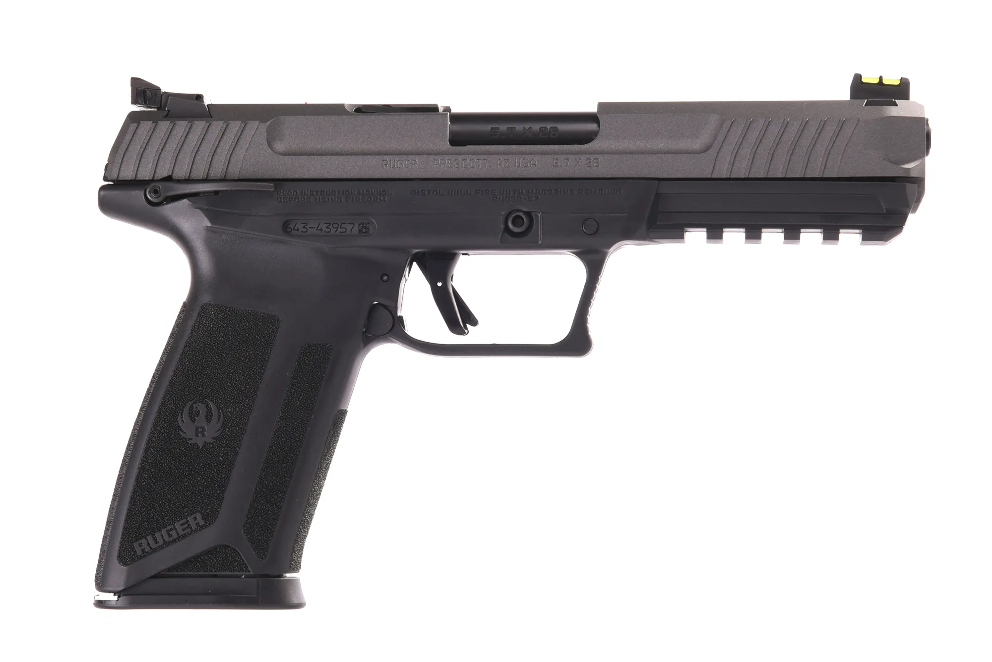 The Ruger-57 is a cutting-edge semi-automatic pistol chambered in 5.7 x 28mm, designed to deliver exceptional performance and versatility. Featuring a Tungsten Cerakote slide, reversible magazine release, and Picatinny-style accessory rail, this firearm is built for modern tactical applications. Complete with fiber optic front sight and adjustable rear sight, the Ruger-57 ensures precise targeting in any situation. Its lightweight polymer frame and ergonomic design make it ideal for extended use, whether for personal defense, competition, or recreational shooting.