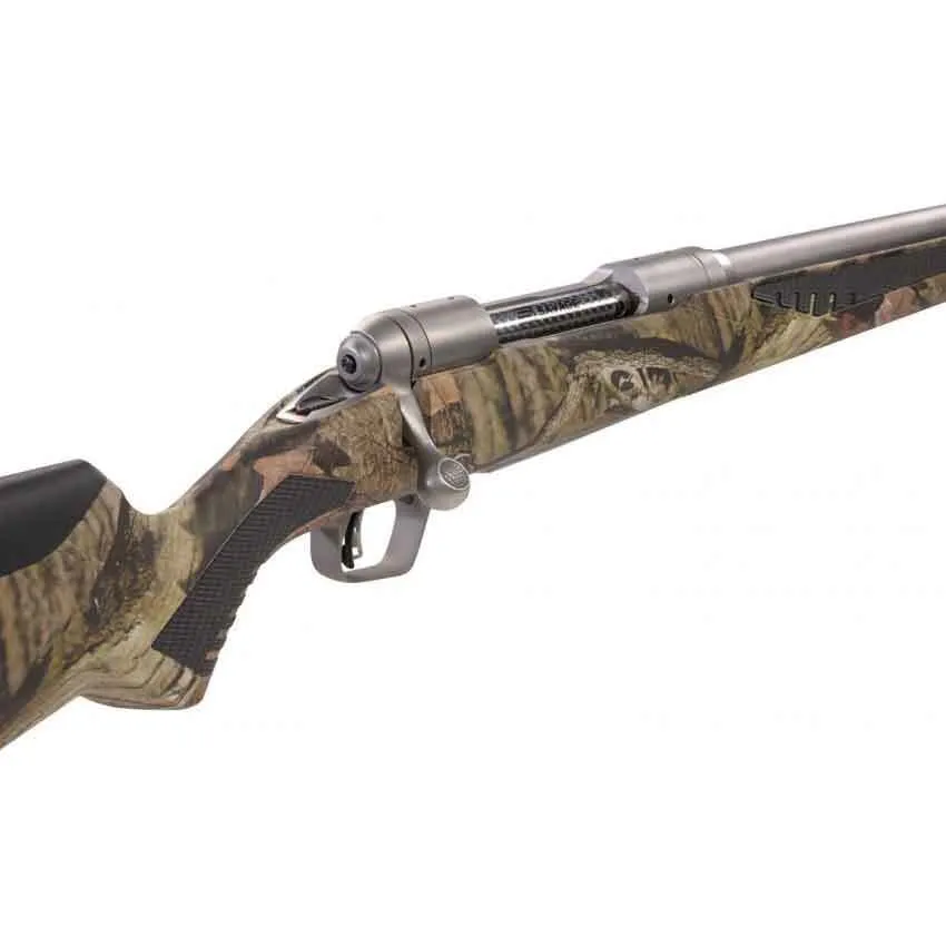The Savage Arms 110 Bear Hunter Matte Stainless Steel Bolt Action Rifle is built to endure tough game hunts and rugged conditions. Featuring Savage’s AccuFit synthetic stock with adjustable comb risers and length-of-pull inserts, this rifle offers personalized fit and superior accuracy. The AccuStock rigid rail system ensures three-dimensional engagement for enhanced stability. Equipped with AccuTrigger for flexibility, a button-rifled stainless steel barrel with a muzzle brake and straight fluting, and a hinged floorplate magazine, the 110 Bear Hunter is designed for performance. The Mossy Oak Break-Up Country camo finish adds concealment in outdoor environments, complemented by soft grip fore-end and pistol grip for comfort. This model boasts a 23-inch stainless steel barrel, making it ideal for big game hunting.