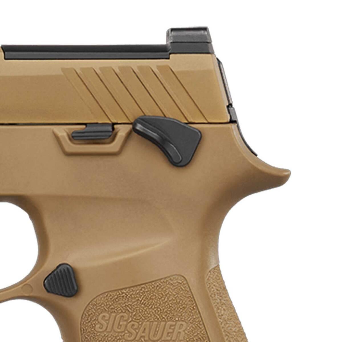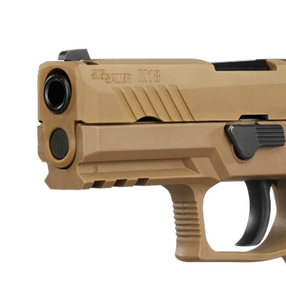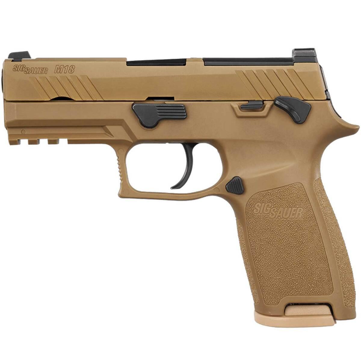 The Sig Sauer M18 9mm Luger Pistol is a civilian release of the U.S. Military’s official sidearm, exhibiting the same superior accuracy, extreme reliability, and unmatched durability. Equipped with SIGLITE night sights, a removable rear sight plate, and an optic-ready coyote PVD finished slide, it seamlessly integrates with ROMEO-M17 red dot optics. Featuring a compact carry-length grip module, striker-fired action, and a curved trigger, this versatile pistol is built for performance. The stainless-steel frame, carbon steel barrel, and M1913 accessory rail ensure durability and adaptability, while the included three 10-round steel magazines, ambidextrous manual safety, and slide catch lever enhance usability. The M18 stands out as a premier choice for personal protection, tactical applications, and civilian carry.