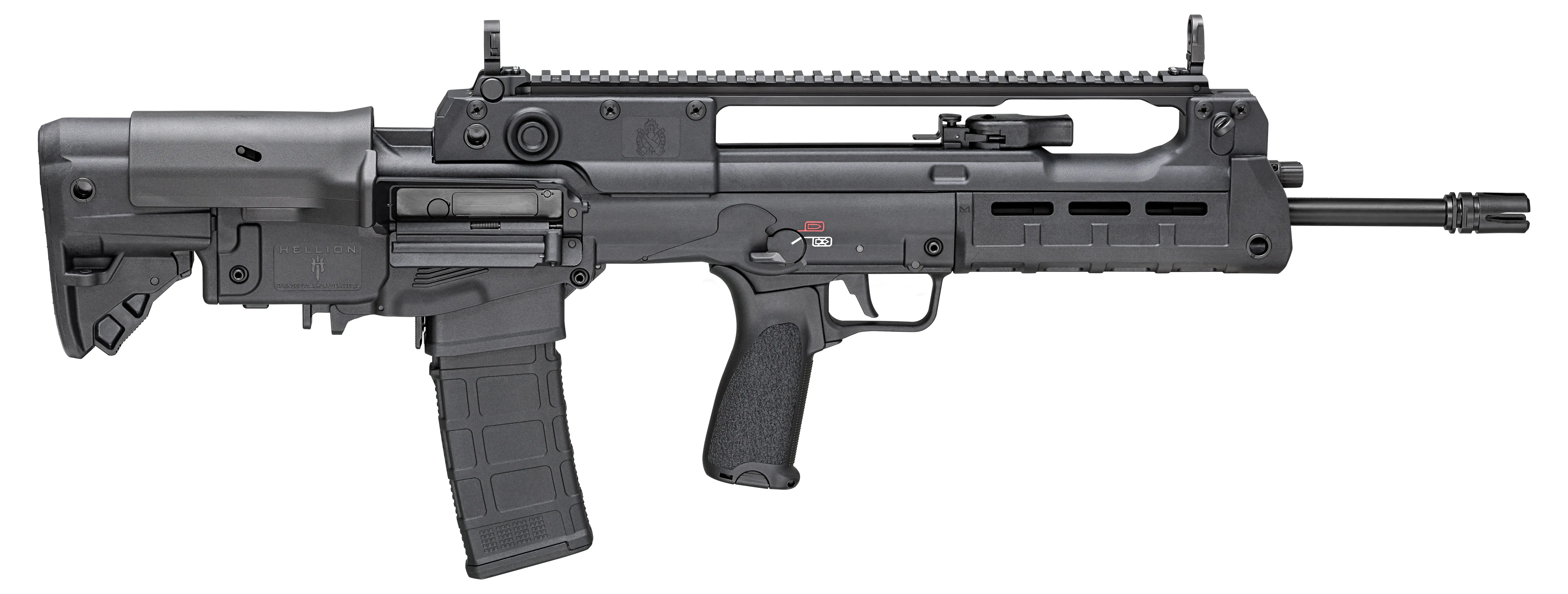 The Springfield Armory Hellion is a cutting-edge rifle designed for modern tactical enthusiasts. Chambered in 223 Rem | 5.56 NATO, it features a bullpup design for enhanced maneuverability and reduced overall length. With an 18-inch barrel, a threaded muzzle with 4-prong flash hider, adjustable low-profile flip-up sights, and ambidextrous controls including a non-reciprocating charging handle, this firearm is built for adaptability and performance. The durable black anodized finish, 5-position adjustable stock, and advanced ergonomics make it ideal for both recreational and professional use. With a 30+1 capacity magazine, this semi-auto rifle is ready to take on any challenge with reliability and precision.