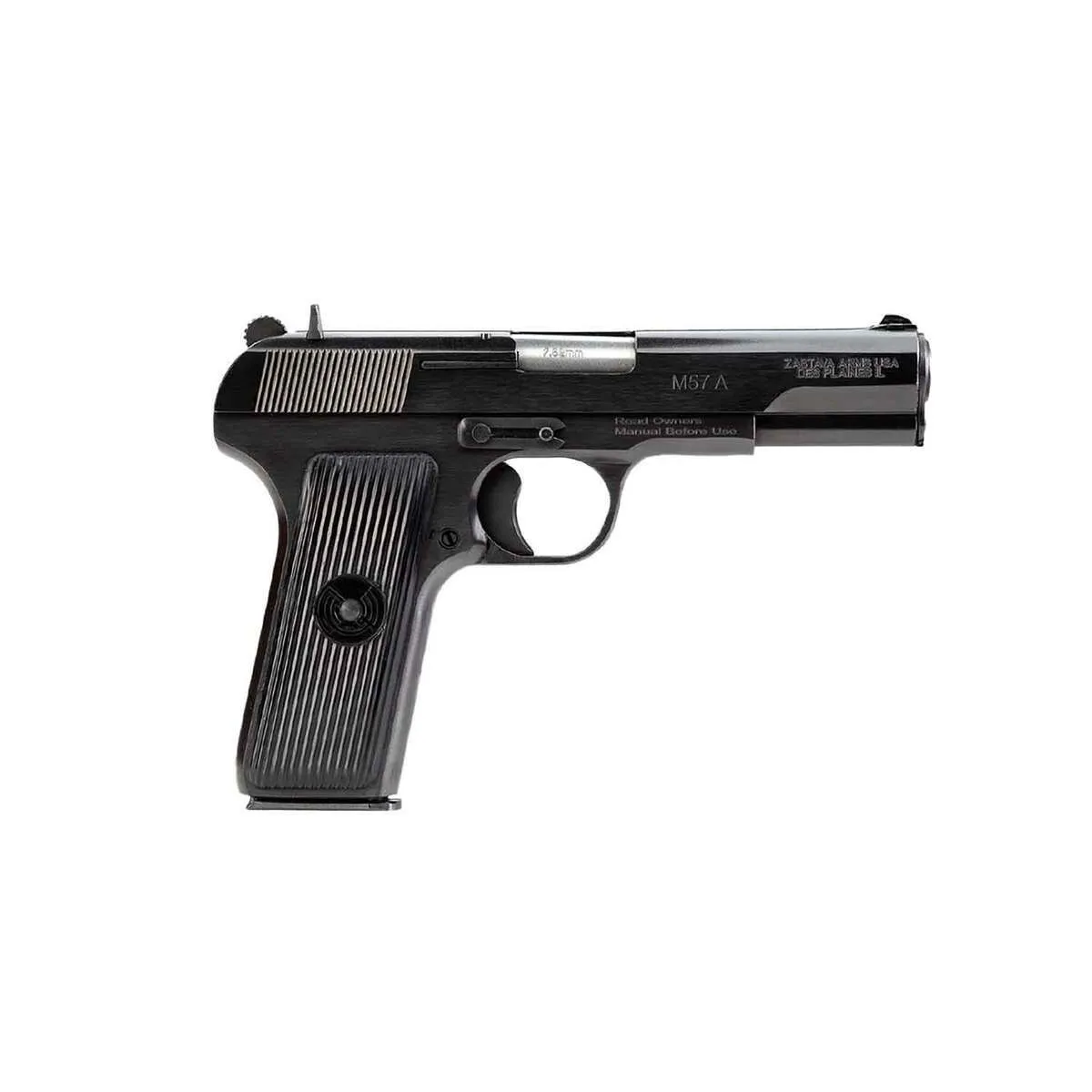 The Zastava Arms M57A 7.62x25mm Tokarev Pistol is a modern upgrade of the classic M57 design, taking cues from the renowned Soviet TT pistol. Featuring a 4.5-inch blued steel barrel and ergonomic polymer grips, this single-action handgun delivers reliability, precision, and exceptional performance. With a capacity of 9+1 rounds, it includes an external safety and fixed sights, making it a durable and user-friendly option for both range and personal defense.